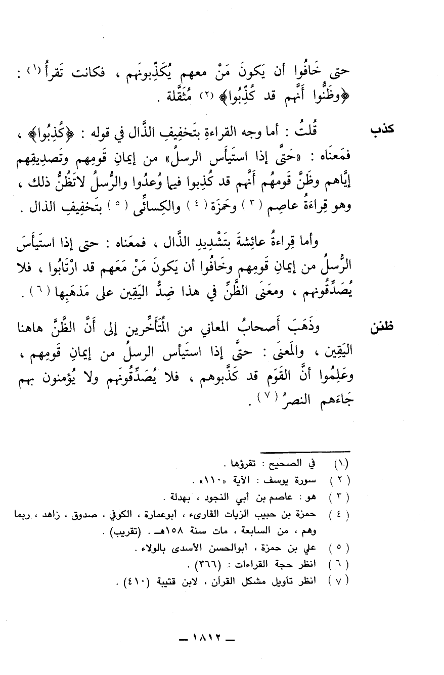 وأما قراءة عائشة بتشديد الذال، فمعناه: حتى إذا استيأس الرسل من إيمان قومهم وخافوا أن يكون من معهم قد ارتابوا، فلا يصدقونهم، ومعنى الظن في هذا ضد اليقين على مذهبها.