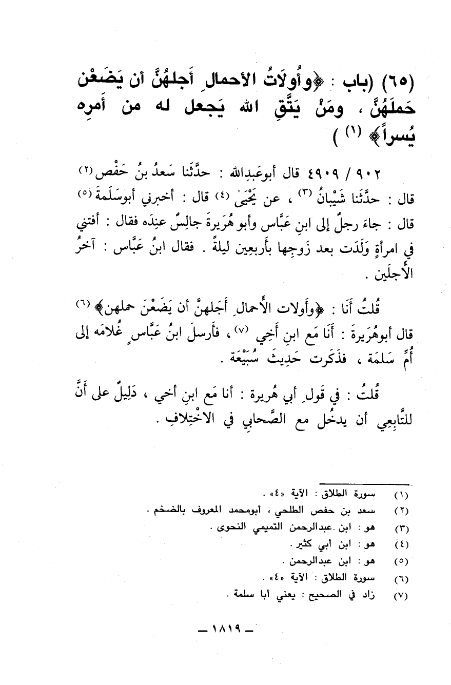 (65) (باب: {وَأُولاَتُ الأَحْمَالِ أَجَلُهُنَّ أَنْ يَضَعْنَ حَمْلَهُنَّ وَمَنْ يَتَّقِ اللَّهَ يَجْعَلْ لَهُ مِنْ أَمْرِهِ يُسْراً})