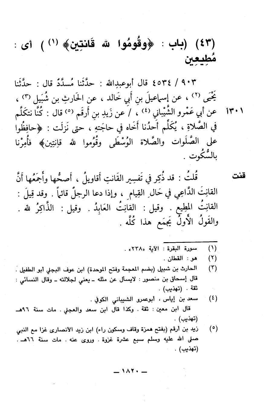 903/ 4534 - قال أبوعبدالله: حَدَّثَنَا مُسَدَّدٌ قال: حَدَّثَنَا يَحْيَى عَنْ إِسْمَاعِيلَ بْنِ أَبِي خَالِدٍ عَنِ الْحَارِثِ بْنِ شُبَيْلٍ عَنْ أَبِي عَمْرٍو الشَّيْبَانِيِّ،/ عَنْ زَيْدِ بْنِ أَرْقَمَ قَالَ: كُنَّا نَتَكَلَّمُ فِي الصَّلاَةِ يُكَلِّمُ أَحَدُنَا أَخَاهُ فِي حَاجَتِهِ، حَتَّى نَزَلَتْ: {حَافِظُوا عَلَى الصَّلَوَاتِ وَالصَّلاَةِ الْوُسْطَى وَقُومُوا لِلَّهِ قَانِتِينَ} فَأُمِرْنَا بِالسُّكُوتِ.