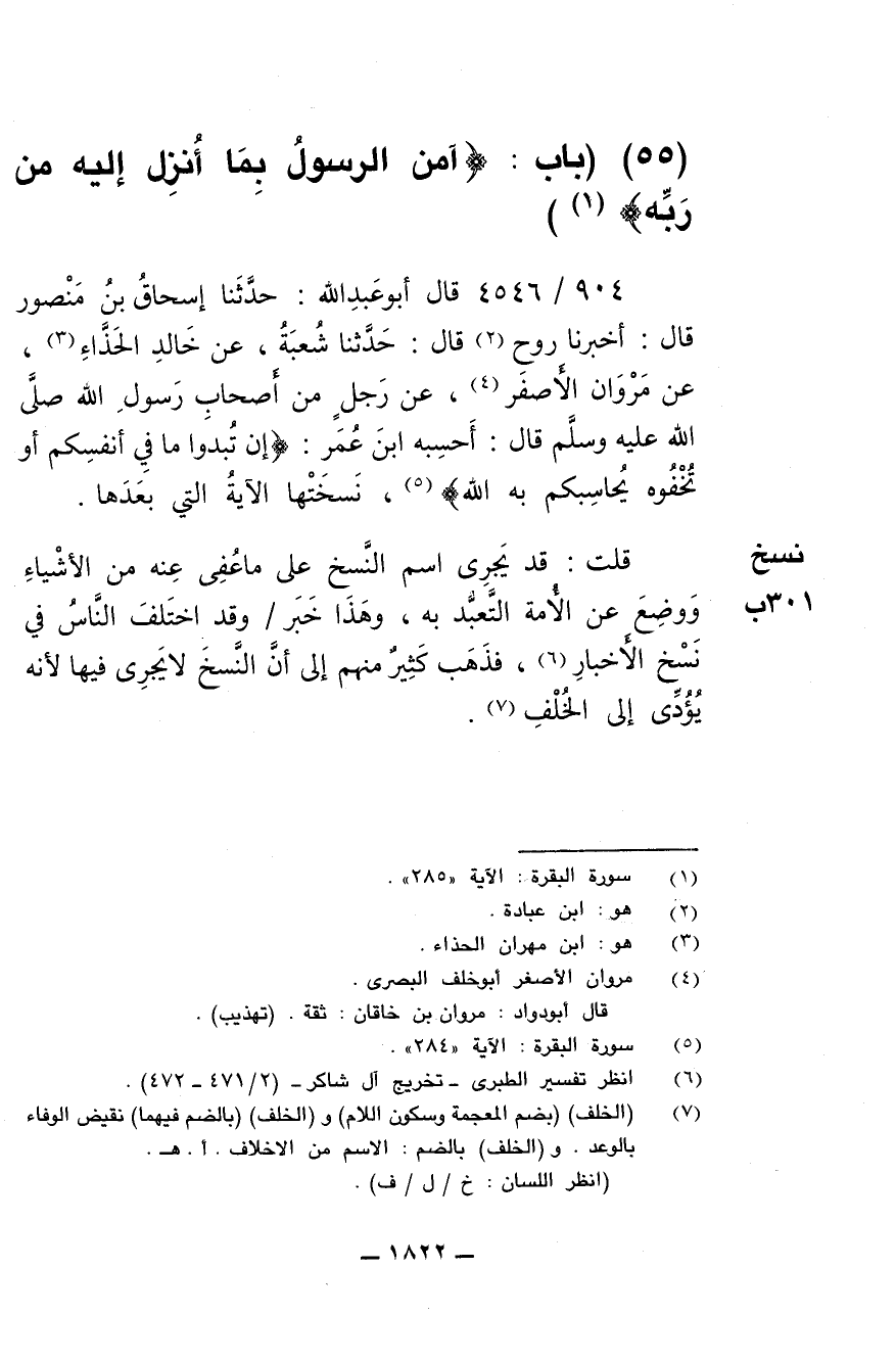 904/ 4546 - قال أبو عبدالله: حَدَّثَنَا إسحاق بن منصور قال: أخبرنا روح قال: حَدَّثَنَا شُعْبَةَ عَنْ خَالِدٍ الْحَذَّاءِ عَنْ مَرْوَانَ الأَصْفَرِ عَنْ رَجُلٍ مِنْ أَصْحَابِ رسول الله صلى الله عليه وسلم قال: أحسبه ابْنُ عُمَرَ: {إِنْ تُبْدُوا مَا فِي أَنْفُسِكُمْ أَوْ تُخْفُوهُ يُحَاسِبْكُمْ بِهِ اللَّهُ} نسختها الآيَةَ التي بعدها.