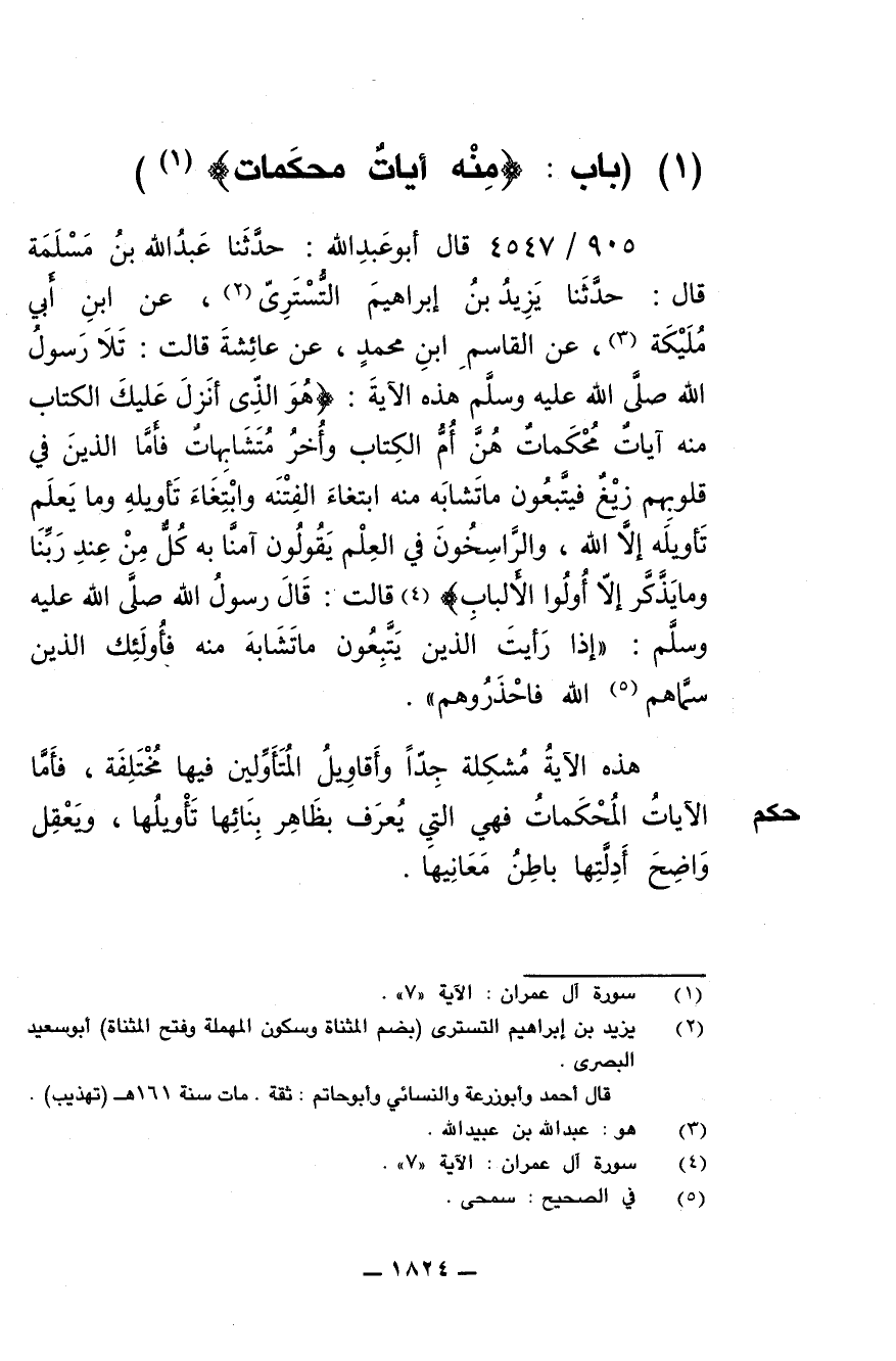 905/ 4547 - قال أبوعبدالله: حَدَّثَنَا عَبْدُ اللَّهِ بْنُ مَسْلَمَةَ قال: حَدَّثَنَا يَزِيدُ بْنُ إِبْرَاهِيمَ التُّسْتَرِىُّ عَنِ ابْنِ أَبِي مُلَيْكَةَ عَنِ الْقَاسِمِ ابْنِ مُحَمَّدٍ عَنْ عَائِشَةَ - رضى الله عنها - قَالَتْ: تَلاَ رَسُولُ اللَّهِ صلى الله عليه وسلم هَذِهِ الآيَةَ: {هُوَ الَّذِى أَنْزَلَ عَلَيْكَ الْكِتَابَ مِنْهُ آيَاتٌ مُحْكَمَاتٌ هُنَّ أُمُّ الْكِتَابِ وَأُخَرُ مُتَشَابِهَاتٌ فَأَمَّا الَّذِينَ فِي قُلُوبِهِمْ زَيْغٌ فَيَتَّبِعُونَ مَا تَشَابَهَ مِنْهُ ابْتِغَاءَ الْفِتْنَةِ وَابْتِغَاءَ تَاوِيلِهِ وما يَعلَم تَأويلَه إلا الله والرَّاسِخُونَ في العِلْم يَقُولُون آمنَّا به كُلٌّ مِنْ عِندِ رَبِّنَا وما يَذَّكَّر إلّا أُولُوا الأَلْبَابِ} قَالَتْ: قَالَ رَسُولُ اللَّهِ صلى الله عليه وسلم: «إِذَا رَأَيْتَ الَّذِينَ يَتَّبِعُونَ مَا تَشَابَهَ مِنْهُ، فَأُولَئِكَ الَّذِينَ سَمَّاهم اللَّهُ، فَاحْذَرُوهُمْ».