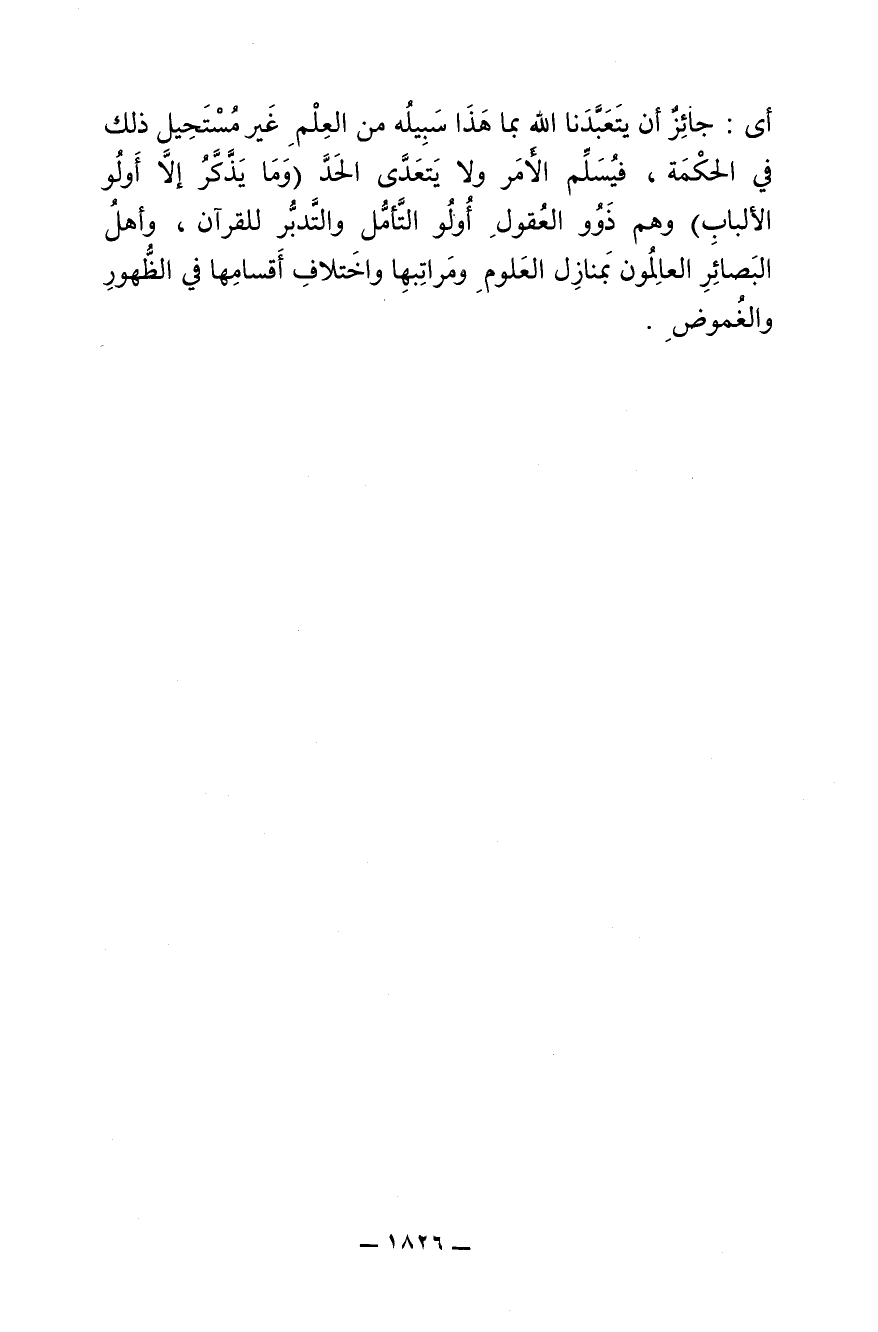 أي: جائز أن يتعبدنا الله بما هذا سبيله من العلم غير مستحيل ذلك في الحكمة، فيسلم الأمر ولا يتعدى الحد (وما يذكر إلا أولو الألباب) وهم ذوو العقول أولو التأمل والتدبر للقرآن، وأهل البصائر العالمون بمنازل العلوم ومراتبها واختلاف أقسامها في الظهور والغموض.