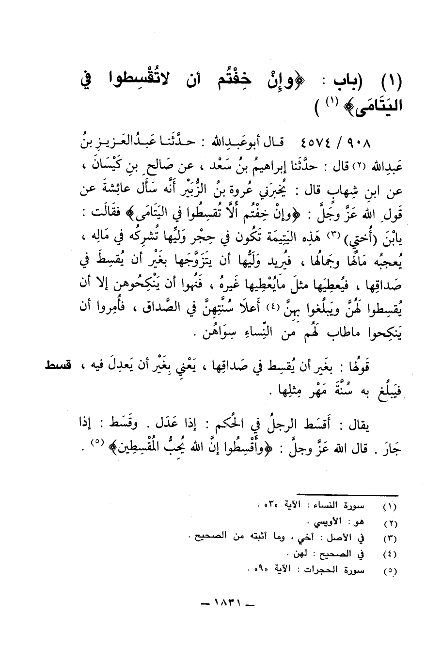 908/ 4574 - قال أبو عبدالله: حَدَّثَنَا عَبْدُ الْعَزِيزِ بْنُ عَبْدِ اللَّهِ قال: حَدَّثَنَا إِبْرَاهِيمُ بْنُ سَعْدٍ عَنْ صَالِحِ بْنِ كَيْسَانَ عَنِ ابْنِ شِهَابٍ قَالَ: يخْبرَنِي عُرْوَةُ بْنُ الزُّبَيْرِ أَنَّهُ سَأَلَ عَائِشَةَ عَنْ قَوْلِ اللَّهِ عزوجل: {وَإِنْ خِفْتُمْ أَنْ لاَ تُقْسِطُوا فِى الْيَتَامَى}. فَقَالَتْ: يَا ابْنَ أُخْتِي، هَذِهِ الْيَتِيمَةُ تَكُونُ فِى حِجْرِ وَلِيِّهَا، تُشْرِكُهُ فِي مَالِهِ، يُعْجِبُهُ مَالُهَا وَجَمَالُهَا، فَيُرِيدُ وَلِيُّهَا أَنْ يَتَزَوَّجَهَا، بِغَيْرِ أَنْ يُقْسِطَ فِي صَدَاقِهَا، فَيُعْطِيَهَا مِثْلَ مَا يُعْطِيهَا غَيْرُهُ، فَنُهُوا أَنْ يَنْكِحُوهُنَّ، إِلاَّ أَنْ يُقْسِطُوا لَهُنَّ، وَيَبْلُغُوا بهُنَّ أَعْلَا سُنَّتِهِنَّ فِى الصَّدَاقِ، فَأُمِرُوا أَنْ يَنْكِحُوا مَا طَابَ لَهُمْ مِنَ النِّسَاءِ سِوَاهُنَّ.