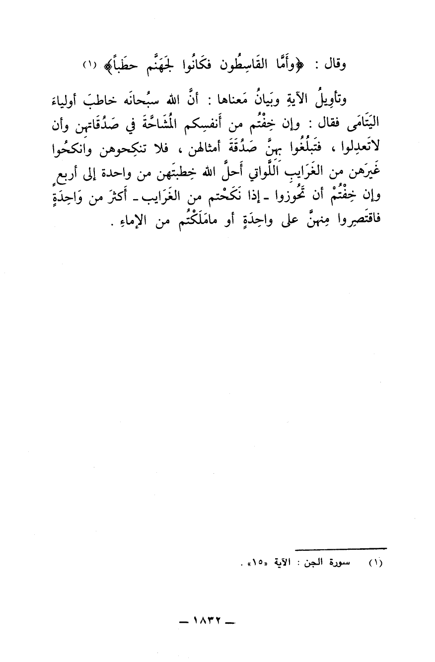 وتأويل الآية وبيان معناها: أن الله سبحانه خاطب أولياء اليتامى فقال: وإن خفتم من أنفسكم المشاحة في صدقاتهن وأن لا تعدلوا، فتبلغوا بهن صدقة أمثالهن، فلا تنكحوهن وانكحوا غيرهن من الغرايب اللواتي أحل الله خطبتهن من واحدة إلى أربع وإن خفتم أن تحوزوا -إذا نكحتم من الغرايب- أكثر من واحدة فاقتصروا منهن على واحدة أو ما ملكتم من الإماء.