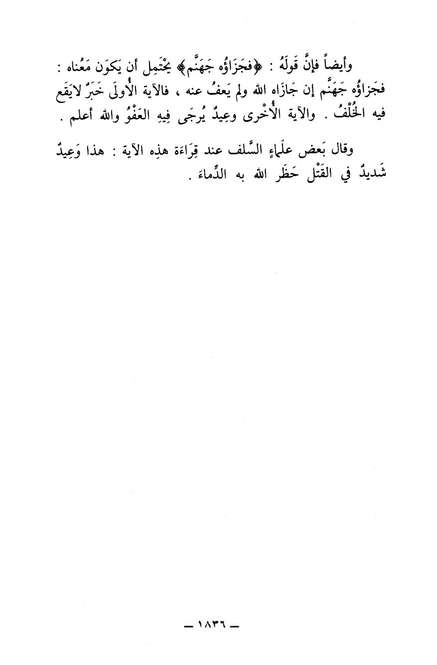 وأيضاً فإن قوله: {فجزاؤه جهنم} يحتمل أن يكون معناه: فجزاؤه جهنم إن جازاه الله ولم يعف عنه، فالآية الأولى خبر لا يقع فيه الخُلف. والآية الأخرى وعيد يرجى فيه العفو والله أعلم.