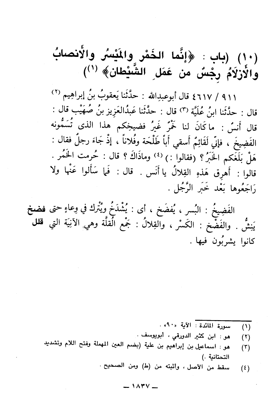 911/ 4617 - قال أبوعبدالله: حَدَّثَنَا يَعْقُوبُ بْنُ إِبْرَاهِيمَ قال: حَدَّثَنَا ابْنُ عُلَيَّةَ قال: حَدَّثَنَا عَبْدُ الْعَزِيزِ بْنُ صُهَيْبٍ قَالَ: قَالَ أَنَسُ - رضى الله عنه -: مَا كَانَ لَنَا خَمْرٌ غَيْرُ فَضِيخِكُمْ هَذَا الَّذِى تُسَمُّونَهُ الْفَضِيخَ. فَإِنِّي لَقَائِمٌ أَسْقِي أَبَا طَلْحَةَ وَفُلاَناً، إِذْ جَاءَ رَجُلٌ فَقَالَ: هَلْ بَلَغَكُمُ الْخَبَرُ؟ فَقَالُوا: وَمَا ذَاكَ؟ قَالَ: حُرِّمَتِ الْخَمْرُ. قَالُوا: أَهْرِقْ هَذِهِ الْقِلاَلَ يَا أَنَسُ. قَالَ: فَمَا سَأَلُوا عَنْهَا وَلاَ رَاجَعُوهَا بَعْدَ خَبَرِ الرَّجُلِ.