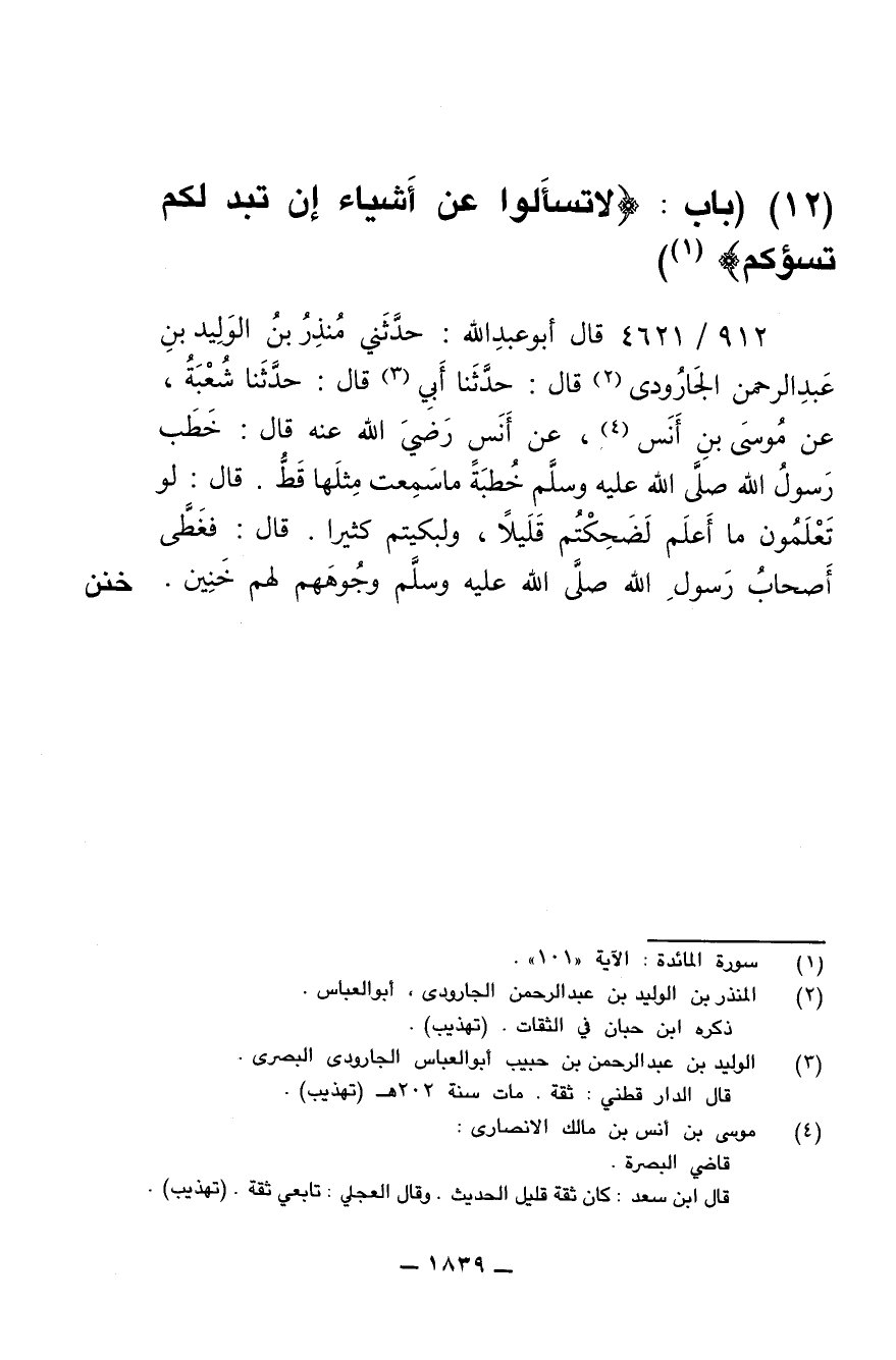 912/ 4621 - قال أبو عبدالله: حَدَّثَني مُنْذِرُ بْنُ الْوَلِيدِ بْنِ عَبْدِ الرَّحْمَنِ الْجَارُودِىُّ قال: حَدَّثَنَا أَبِي قال: حَدَّثَنَا شُعْبَةُ عَنْ مُوسَى بْنِ أَنَسٍ عَنْ أَنَسٍ - رضى الله عنه - قَالَ: خَطَبَ رَسُولُ اللَّهِ صلى الله عليه وسلم خُطْبَةً مَا سَمِعْتُ مِثْلَهَا قَطُّ. قَالَ: «لَوْ تَعْلَمُونَ مَا أَعْلَمُ لَضَحِكْتُمْ قَلِيلاً وَلَبَكَيْتُمْ كَثِيراً». قَالَ: فَغَطَّى أَصْحَابُ رَسُولِ اللَّهِ صلى الله عليه وسلم وُجُوهَهُمْ لَهُمْ خَنِينٌ.