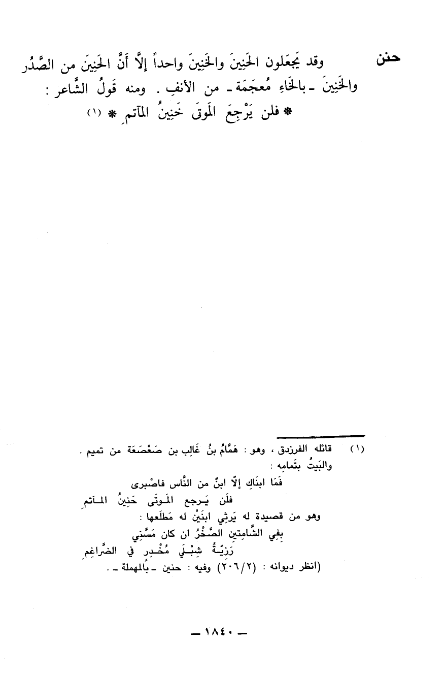 وقد يجعلون الحنين والخنين واحدا إلا أن الحنين من الصدر والخنين -بالخاء معجمة- من الأنف. ومنه قول الشاعر: