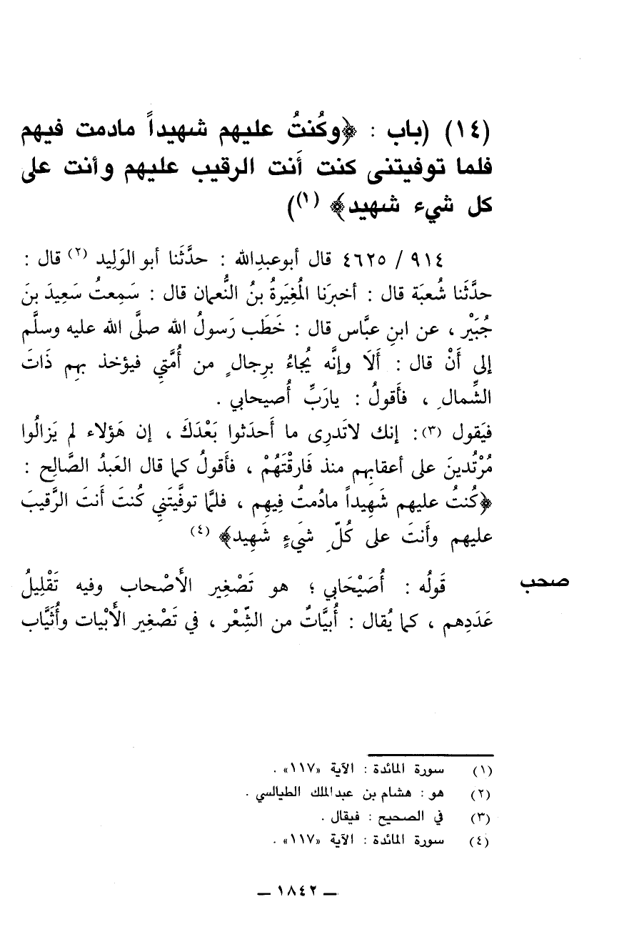 914/ 4625 - قال أبوعبدالله: حَدَّثَنَا أَبُو الْوَلِيدِ قال: حَدَّثَنَا شُعْبَةُ قال: أَخْبَرَنَا الْمُغِيرَةُ بْنُ النُّعْمَانِ قَالَ: سَمِعْتُ سَعِيدَ بْنَ جُبَيْرٍ عَنِ ابْنِ عَبَّاسٍ - رضى الله عنهما - قَالَ: خَطَبَ رَسُولُ اللَّهِ صلى الله عليه وسلم إلى أن قَال «أَلاَ وَإِنَّهُ يُجَاءُ بِرِجَالٍ مِنْ أُمَّتِي فَيُؤْخَذُ بِهِمْ ذَاتَ الشِّمَالِ، فَأَقُولُ: يَا رَبِّ أُصَيْحَابِي. فَيقولُ: إِنَّكَ لاَ تَدْرِى مَا أَحْدَثُوا بَعْدَكَ. إِنَّ هَؤُلاَءِ لَمْ يَزَالُوا مُرْتَدِّينَ عَلَى أَعْقَابِهِمْ مُنْذُ فَارَقْتَهُمْ فَأَقُولُ كَمَا قَالَ الْعَبْدُ الصَّالِحُ: {وَكُنْتُ عَلَيْهِمْ شَهِيداً مَا دُمْتُ فِيهِمْ فَلَمَّا تَوَفَّيْتَنِي كُنْتَ أَنْتَ الرَّقِيبَ عَلَيْهِمْ وأنت على كل شيء شهيد}».