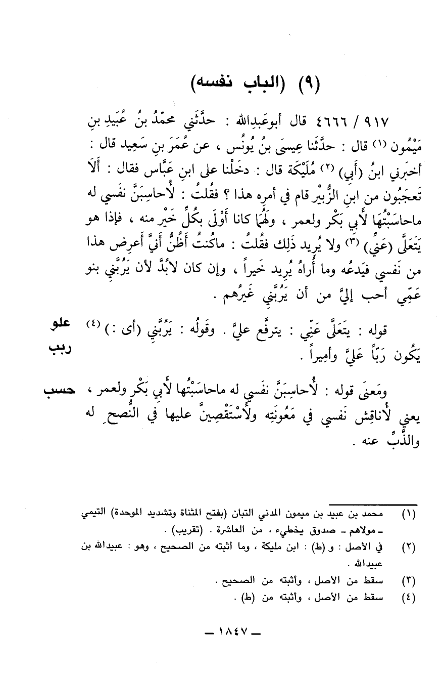 917/ 4666 - قال أبوعبدالله: حَدَّثَني مُحَمَّدُ بْنُ عُبَيْدِ بْنِ مَيْمُونٍ قال: حَدَّثَنَا عِيسَى بْنُ يُونُسَ عَنْ عُمَرَ بْنِ سَعِيدٍ قَالَ: أَخْبَرَنِي ابْنُ أَبِي مُلَيْكَةَ قال: دَخَلْنَا عَلَى ابْنِ عَبَّاسٍ فَقَالَ: أَلاَ تَعْجَبُونَ من اِبْنِ الزُّبَيْرِ قَامَ فِي أَمْرِهِ هَذَا؟ فَقُلْتُ: لأُحَاسِبَنَّ نَفْسِي لَهُ مَا حَاسَبْتُهَا لأَبِي بَكْرٍ وَلِعُمَرَ، وَلَهُمَا كَانَا أَوْلَى بِكُلِّ خَيْرٍ مِنْهُ فَإِذَا هُوَ يَتَعَلَّى عَنِّي وَلاَ يُرِيدُ ذَلِكَ فَقُلْتُ: مَا كُنْتُ أَظُنُّ أَنِّي أَعْرِضُ هَذَا مِنْ نَفْسِي، فَيَدَعُهُ، وَمَا أُرَاهُ يُرِيدُ خَيْراً، وَإِنْ كَانَ لاَ بُدَّ لأَنْ يَرُبَّنِي بَنُو عَمِّي أَحَبُّ إِلَيَّ مِنْ أَنْ يَرُبَّنِي غَيْرُهُمْ.