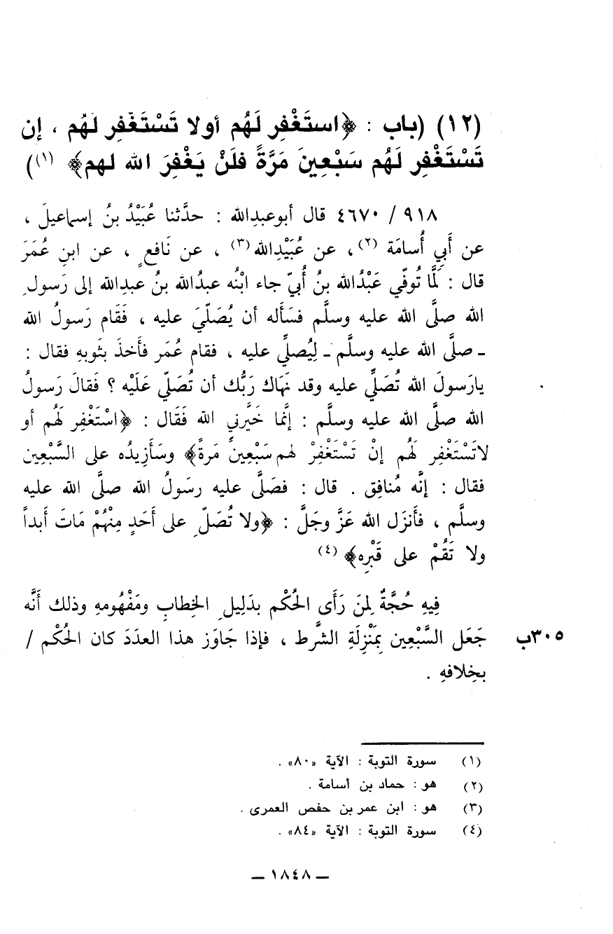 (12) (باب: {اسْتَغْفِرْ لَهُمْ أَوْ لاَ تَسْتَغْفِرْ لَهُمْ إِنْ تَسْتَغْفِرْ لَهُمْ سَبْعِينَ مَرَّةً فلن يغفر الله لهم}).