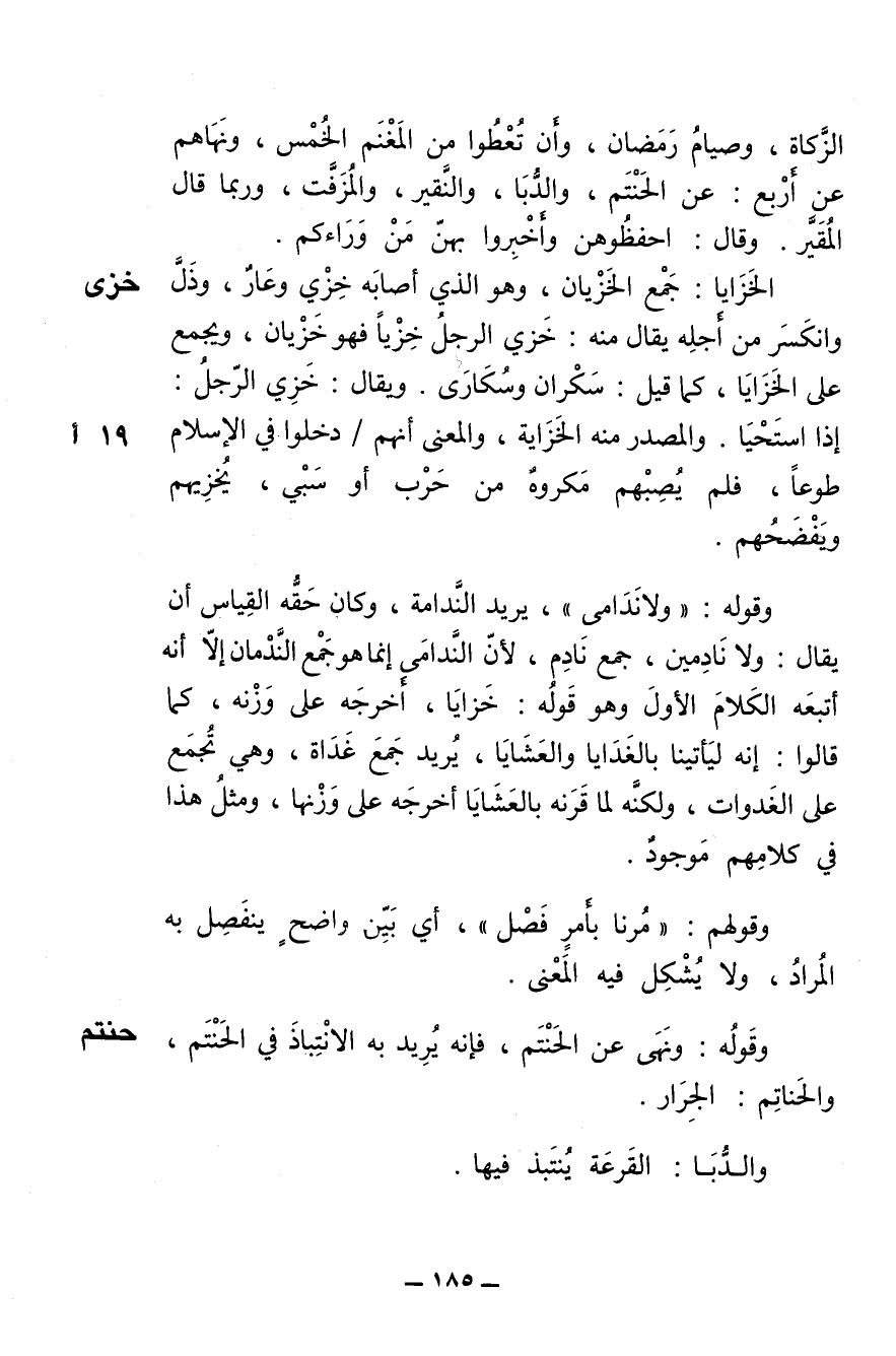 الزكاة، وصيام رمضان، وأن تعطوا من المغنم الخمس، ونهاهم عن أربع: عن الحنتم، والدبا [الدباء] والنقير، والمزفت، وربما قال: المقير. وقال: احفظوهن وأخبروا بهن من وراءكم.