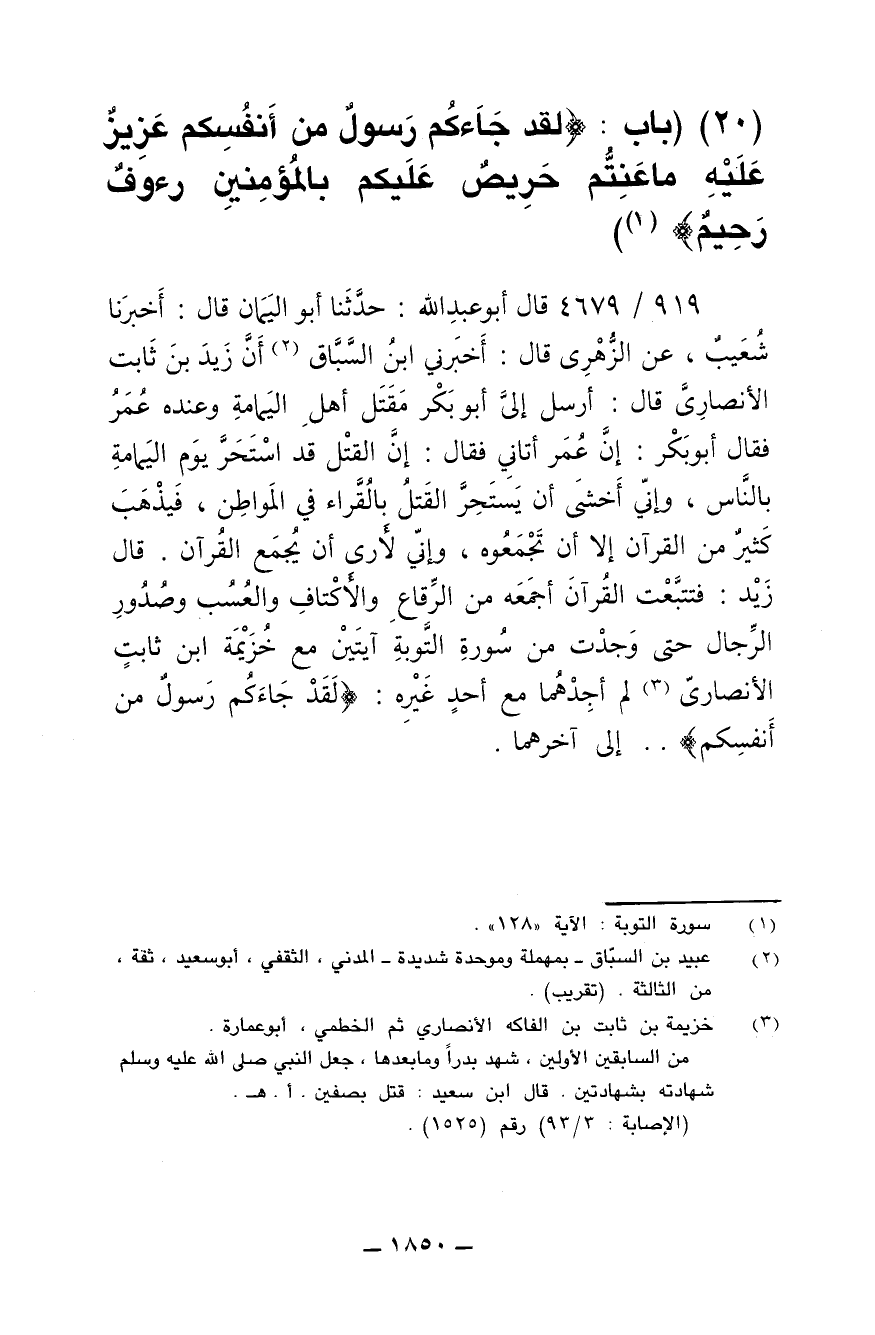 919/ 4679 - قال أبوعبدالله: حَدَّثَنَا أَبُو الْيَمَانِ قال: أَخْبَرَنَا شُعَيْبٌ عَنِ الزُّهْرِىِّ قَالَ: أَخْبَرَنِي ابْنُ السَّبَّاقِ أَنَّ زَيْدَ بْنَ ثَابِتٍ الأَنْصَارِىَّ - رضى الله عنه - قَالَ: أَرْسَلَ إِلَىَّ أَبُو بَكْرٍ مَقْتَلَ أَهْلِ الْيَمَامَةِ وَعِنْدَهُ عُمَرُ، فَقَالَ أَبُو بَكْرٍ: إِنَّ عُمَرَ أَتَانِي فَقَالَ: إِنَّ الْقَتْلَ قَدِ اسْتَحَرَّ يَوْمَ الْيَمَامَةِ بِالنَّاسِ، وَإِنِّي أَخْشَى أَنْ يَسْتَحِرَّ الْقَتْلُ بِالْقُرَّاءِ فِى الْمَوَاطِنِ فَيَذْهَبَ كَثِيرٌ مِنَ الْقُرْآنِ، إِلاَّ أَنْ تَجْمَعُوهُ، وَإِنِّي لأَرَى أَنْ يُجْمَعَ الْقُرْآنَ قال زيد: فَتَتَبَّعْتُ الْقُرْآنَ أَجْمَعُهُ مِنَ الرِّقَاعِ وَالأَكْتَافِ وَالْعُسُبِ وَصُدُورِ الرِّجَالِ، حَتَّى وَجَدْتُ مِنْ سُورَةِ التَّوْبَةِ آيَتَيْنِ مَعَ خُزَيْمَةَ ابن ثابتٍ الأَنْصَارِىِّ، لَمْ أَجِدْهُمَا مَعَ أَحَدٍ غَيْرِهِ: {لَقَدْ جَاءَكُمْ رَسُولٌ مِنْ أَنْفُسِكُمْ} ... إلى آخرهما.