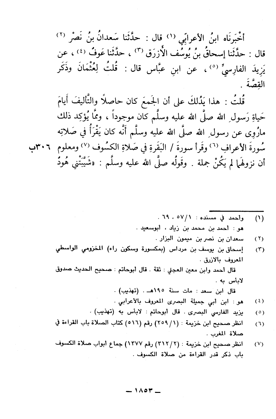 قلت: هذا يدلك على أن الجمع كان حاصلا والتأليف أيام حياة رسول الله صلى الله عليه وسلم كان موجودا، ومما يؤكد ذلك ما روي عن رسول الله صلى الله عليه وسلم أنه كان يقرأ في صلاته سورة الأعراف وقرأ سورة / البقرة في صلاة الكسوف ومعلوم أن نزولهما لم يكن جملة. وقوله صلى الله عليه وسلم: "شيبتني هود