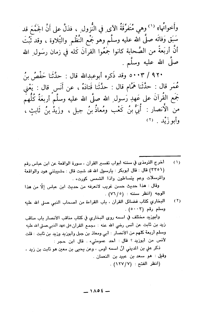 920/ 5003 - وقد ذكره أبو عبدالله قال: حَدَّثَنَا حَفْصُ بْنُ عُمَرَ قال: حَدَّثَنَا هَمَّامٌ قال: حَدَّثَنَا قَتَادَةُ عن أَنَسَ - رضى الله عنه - قال: يعني جَمَعَ الْقُرْآنَ عَلَى عَهْدِ رسول الله صلى الله عليه وسلم أَرْبَعَةٌ كُلُّهُمْ مِنَ الأَنْصَارِ: أُبَيُّ بْنُ كَعْبٍ وَمُعَاذُ بْنُ جَبَلٍ، وَزَيْدُ بْنُ ثَابِتٍ، وَأَبُو زَيْدٍ.