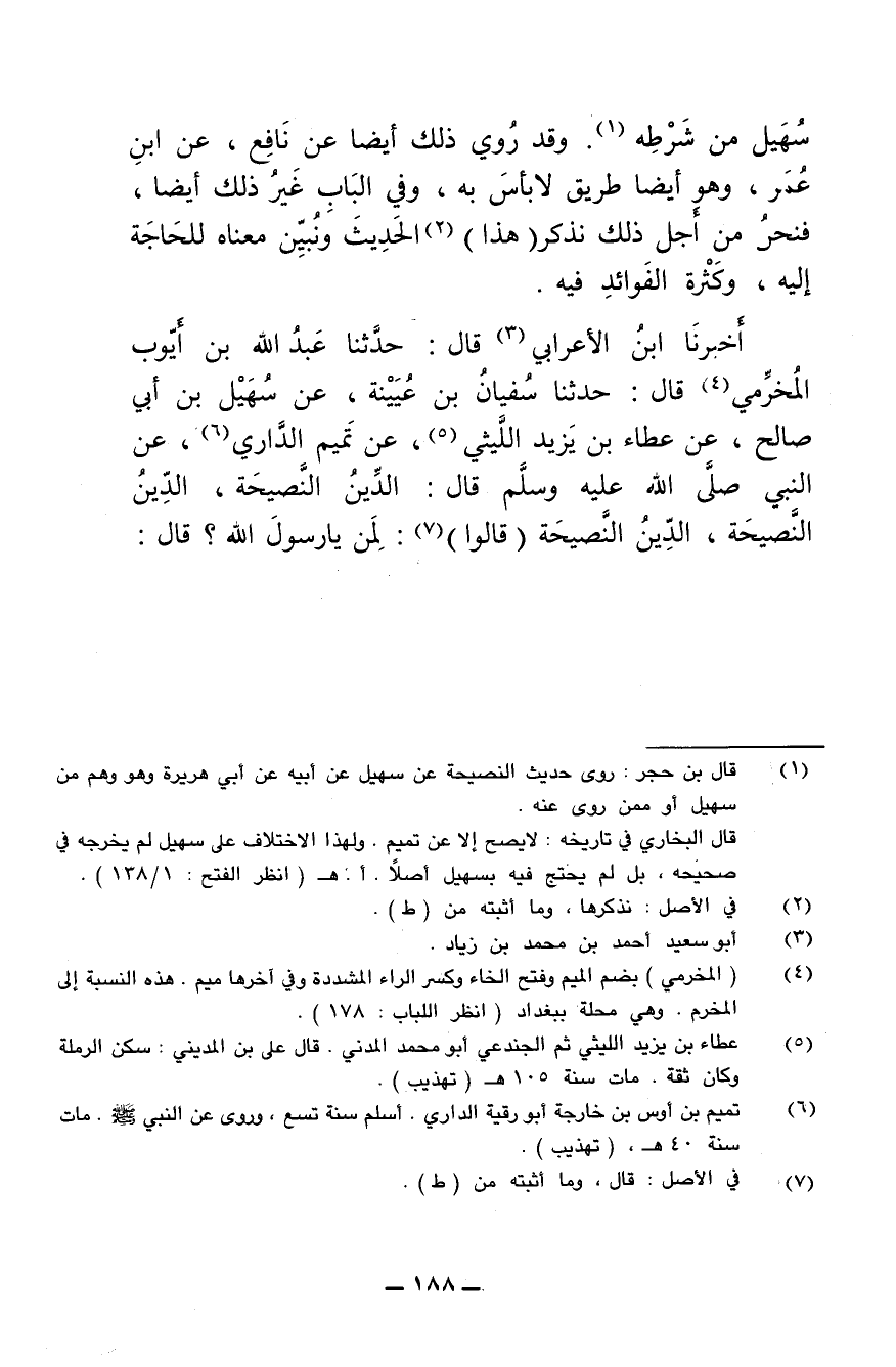 أخبرنا ابن الأعرابي قال: حدثنا عبد الله بن أيوب المخرمي قال: حدثنا سفيان بن عيينة، عن سهيل بن أبي صالح، عن عطاء بن يزيد الليثي، عن تميم الداري، عن النبي صلى الله عليه وسلم قال: الدين النصيحة، الدين النصيحة، الدين النصيحة (قالوا): لمن يا رسول الله؟ قال: