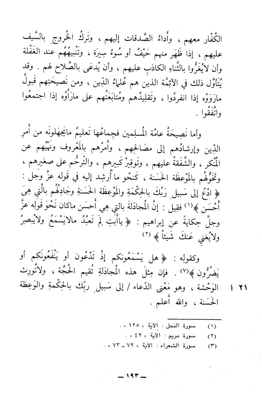 وأما نصيحة عامة المسلمين فجماعها تعليم ما يجهلونه من أمر الدين وإرشادهم إلى مصالحهم، وأمرهم بالمعروف ونهيهم عن المنكر، والشفقة عليهم، وتوقير كبيرهم، والترحم على صغيرهم، وتخولهم بالموعظة الحسنة، كنحو ما أرشد إليه في قوله عز وجل: {ادع إلى سبيل ربك بالحكمة والموعظة الحسنة وجادلهم بالتي هي أحسن} فقيل: إن المجادلة بالتي هي أحسن ما كان نحو قوله عز وجل حكاية عن إبراهيم: {يا أبت لم تعبد ما لا يسمع ولا يبصر ولا يغني عنك شيئا}.