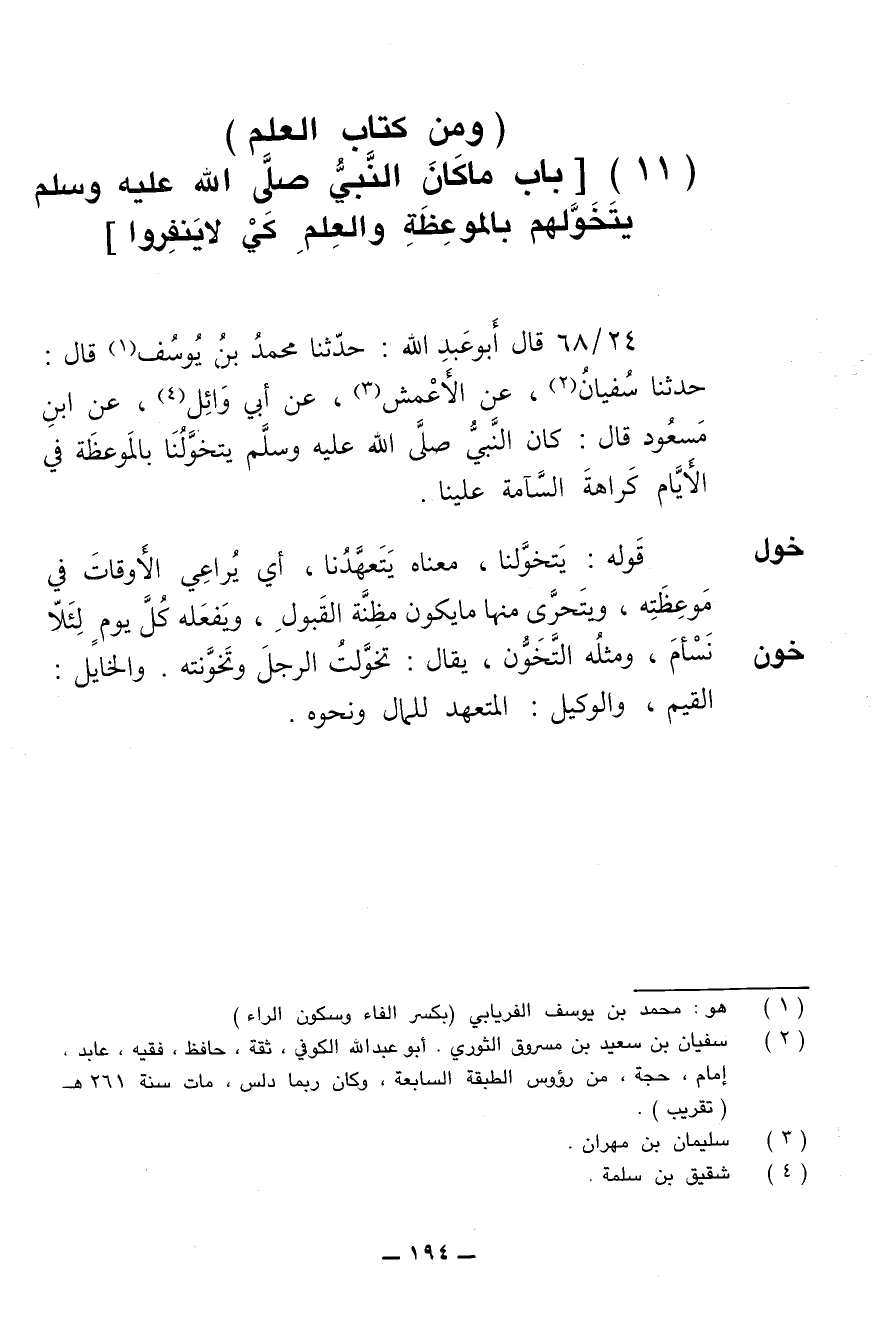 24/ 68 - قال أبو عبد الله: حدثنا محمد بن يوسف قال: حدثنا سفيان، عن الأعمش، عن أبي وائل، عن ابن مسعود قال: كان النبي صلى الله عليه وسلم يتخولنا بالموعظة في الأيام كراهة السآمة علينا.
