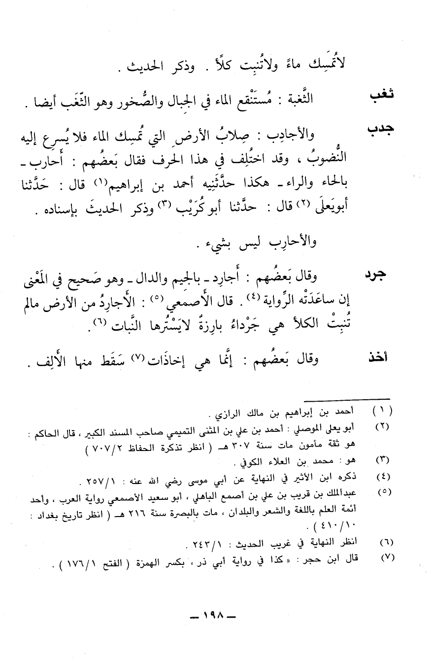 والأجادب: صلاب الأرض التي تمسك الماء فلا يسرع إليه النضوب، وقد اختلف في هذا الحرف فقال بعضهم: أحارب -بالحاء الراء- هكذا حدثنيه أحمد بن إبراهيم قال: حدثنا أبو يعلى قال: حدثنا أبو كريب وذكر الحديث بإسناده.