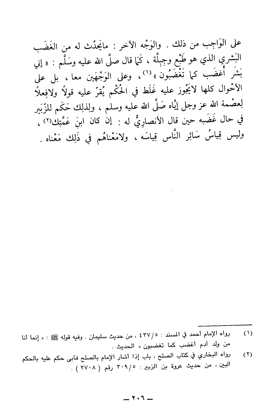 على الواجب من ذلك. والوجه الآخر: ما يحدث له من الغضب البشري الذي هو طبع وجبلة، كما قال صلى الله عليه وسلم: (إني بشر أغضب كما تغضبون)، وعلى الوجهين معا، بل على الأحوال كلها لا يجوز عليه غلط في الحكم يقر عليه قولا ولا فعلا لعصمة الله عز وجل إياه صلى الله عليه وسلم، ولذلك حكم للزبير في حال غضبه حين قال للأنصاري له: إن [أن] كان ابن عمتك، وليس قياس سائر الناس قياسه، ولا معناهم في ذلك معناه.