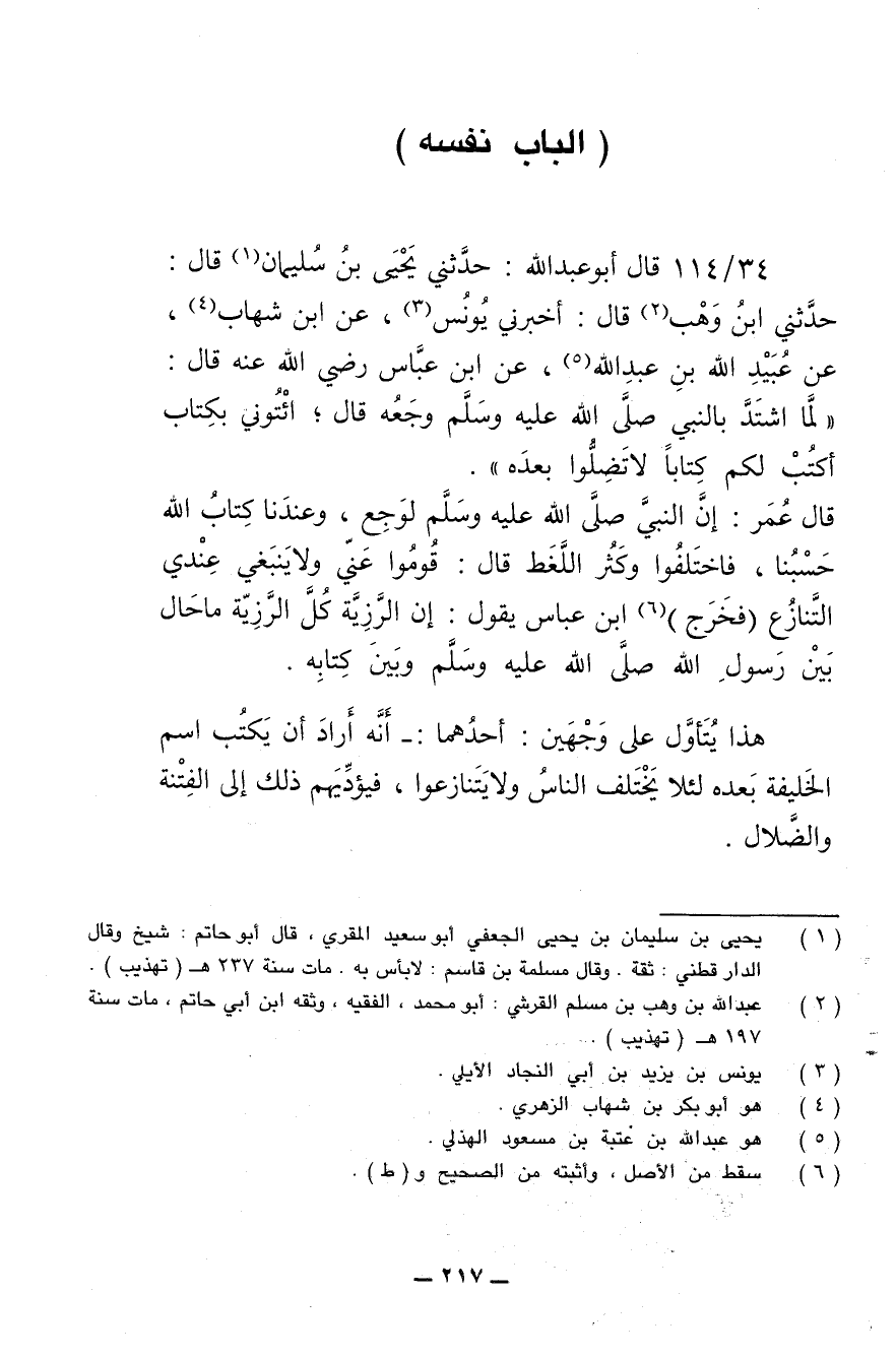 34/ 114 - قال أبو عبد الله: حدثني يحيى بن سليمان قال: حدثني ابن وهب قال: أخبرني يونس، عن ابن شهاب، عن عبيد الله بن عبد الله، عن ابن عباس رضي الله عنه قال: (لما اشتد بالنبي صلى الله عليه وسلم وجعُه قال: ائتوني بكتاب أكتب لكم كتابا لا تضلوا بعده).