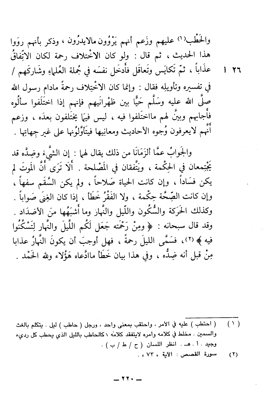 والحَطْبِ عليهم وزعم أنهم يروون ما لا يدرون، وذكر بأنهم رووا هذا الحديث، ثم قال: ولو كان الاختلاف رحمة لكان الاتفاق عذابا، ثم تكايس وتعاقل فأدخل نفسه في جملة العلماء وشاركهم في تفسيره وتأويله فقال: وإنما كان الاختلاف رحمة ما دام رسول الله صلى الله عليه وسلم حيا بين ظهرانيهم فإنهم إذا اختلفوا سألوه فأجابهم وبين لهم ما اختلفوا فيه، ليس فيما يختلفون بعده، وزعم أنهم لا يعرفون وجوه الأحاديث ومعانيها فيتأولونها على غير جهاتها.