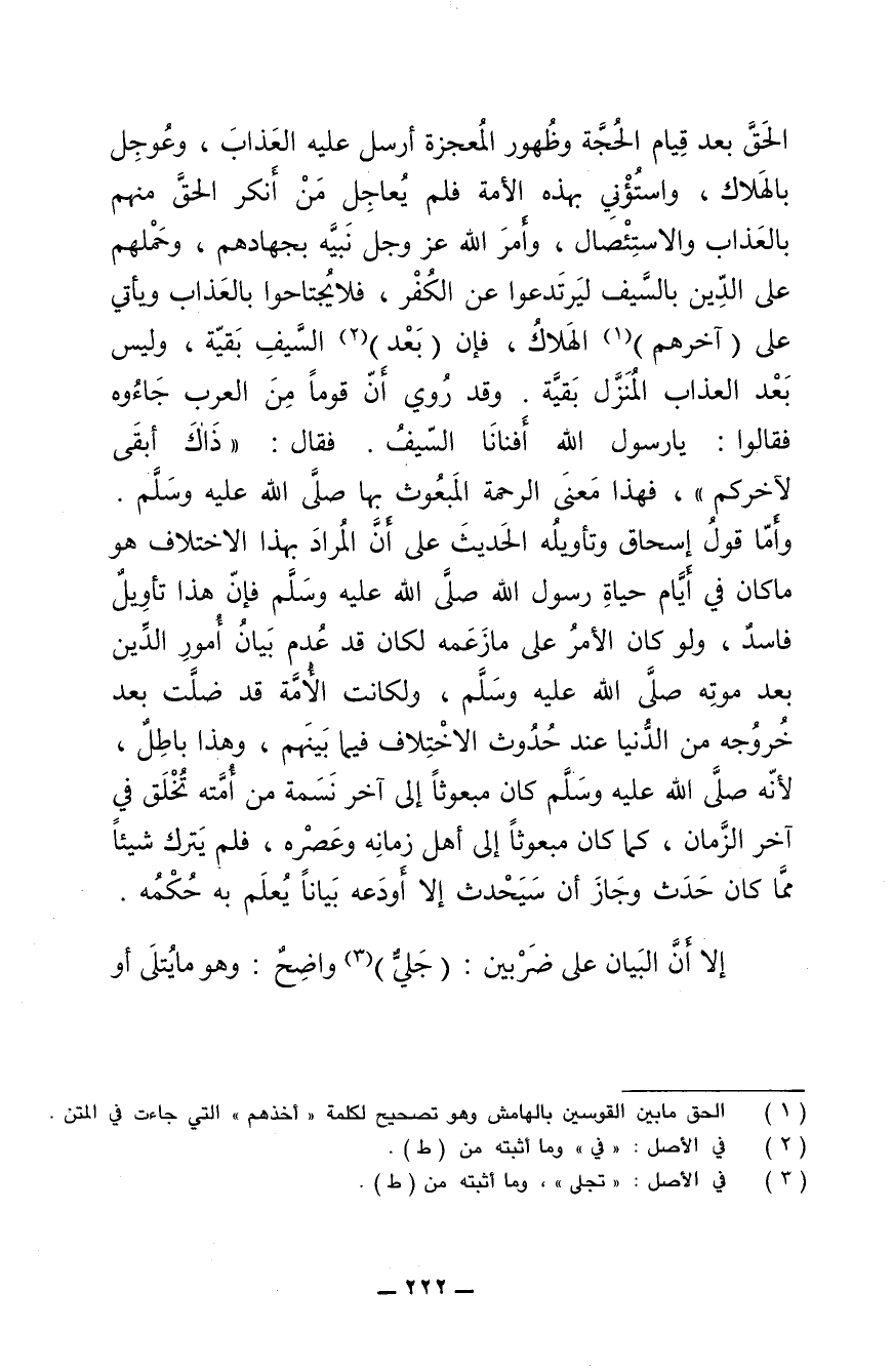 الحق بعد قيام الحجة وظهور المعجزة أرسل عليه العذاب، وعوجل بالهلاك، واستؤني بهذه الأمة فلم يعاجل من أنكر الحق منهم بالعذاب والاستئصا، وأمر الله عز وجل نبيه بجهادهم، وحملهم على الدين بالسيف ليرتدعوا عن الكفر، فلا يجتاحوا بالعذاب ويأتي على (آخرهم) الهلاك، فإن (بعد) السيف بقية، وليس بعد العذاب المنزل بقية. وقد روي أن قوما من العرب جاءوه فقالوا: يا رسول الله أفنانا السيف. فقال: (ذاك أبقى لآخركم)، فهذا معنى الرحمة المبعوث بها صلى الله عليه وسلم. وأما قول إسحاق وتأويله الحديث على أن المراد بهذا الاختلاف هو ما كان في أيام حياة رسول الله صلى الله عليه وسلم فإن هذا تأويل فاسد، ولو كان الأمر على ما زعمه لكان قد عدم بيان أمور الدين بعد موته صلى الله عليه وسلم، ولكانت الأمة قد ضلت بعد خروجه من الدنيا عند حدوث الاختلاف فيما بينهم، وهذا باطل، لأنه صلى الله عليه وسلم كان مبعوثا إلى آخر نسمة من أمته تخلق في آخر الزمان، كما كان مبعوثا إلى أهل زمانه وعصره، فلم يترك شيئا مما كان حدث وجاز أن سيحدث إلا أودعه بيانا يعلم به حكمُه.