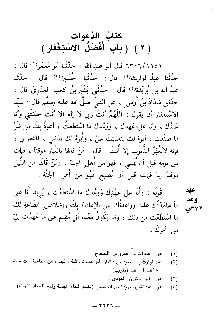 1151/ 6306 - قال أبو عبد الله: حدثنا أبو معمر قال: حدثنا عبد الوارث قال: حدثنا الحسين قال: حدثنا عبد الله بن بريدة قال: حدثني بشير بن كعب العدوي قال: حدثني شداد بن أوس، عن النبي صلى الله عليه وسلم قال: سيد الاستغفار أن يقول: اللهم أنت ربي لا إل إلا أنت خلقتني وأنا عبدك، وأنا على عهدك، ووعدك ما استطعت، أعوذ بك منشر ما صنعت، أبوء لك بنعمتك علي، وأبوء لك بذنبي، فاغفر لي، فإنه لا يغفر الذنوب إلا أنت. قال: من قالها بالنهار موقنا، فمات من يومه قبل أن يمسي، فهو من أهل الجنة، ومن قالها من الليل موقنا بها فمات قبل أن يصبح فهو من أهل الجنة.