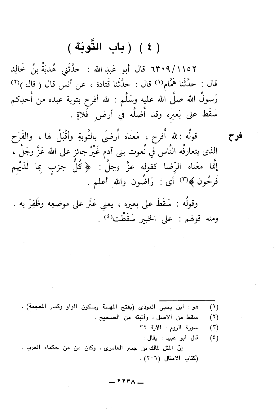 1152/ 6309 - قال أبو عبد الله: حدثني هدبة بن خالد قال: حدثنا همام قال: حدثنا قتادة، عن أنس قال (قال) رسول الله صلى الله عليه وسلم: لله أفرح بتوبة عبده من أحدكم سقط على بعيره وقد أضله في أرض فلاة.