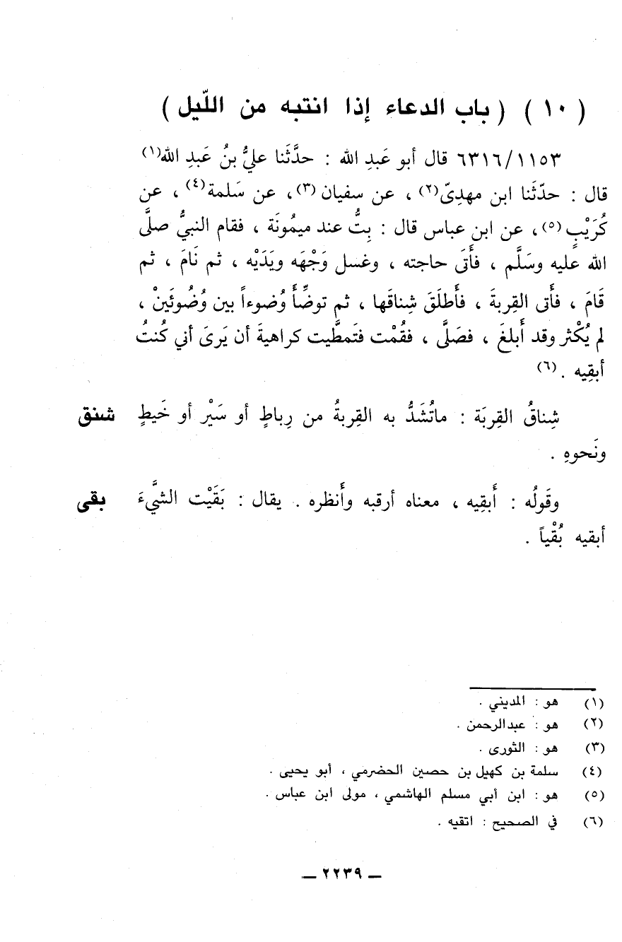 1153/ 6316 - قال أبو عبد الله: حدثنا علي بن عبد الله قال: حدثنا ابن مهدي، عن سفيان، عن سلمة، عن كريب، عن ابن عباس قال: بت عند ميمونة، فقام النبي صلى الله عليه وسلم، فأتى حاجته، وغسل وجهه ويديه، ثم نام، ثم قام، فأتى القربة، فأطلق شناقها، ثم توضأ وضوءا بين وضوئين، لم يكثر وقد أبلغ، فصلى، فقمت فتمطيت كراهية أن يرى أني كنت أبقيه.