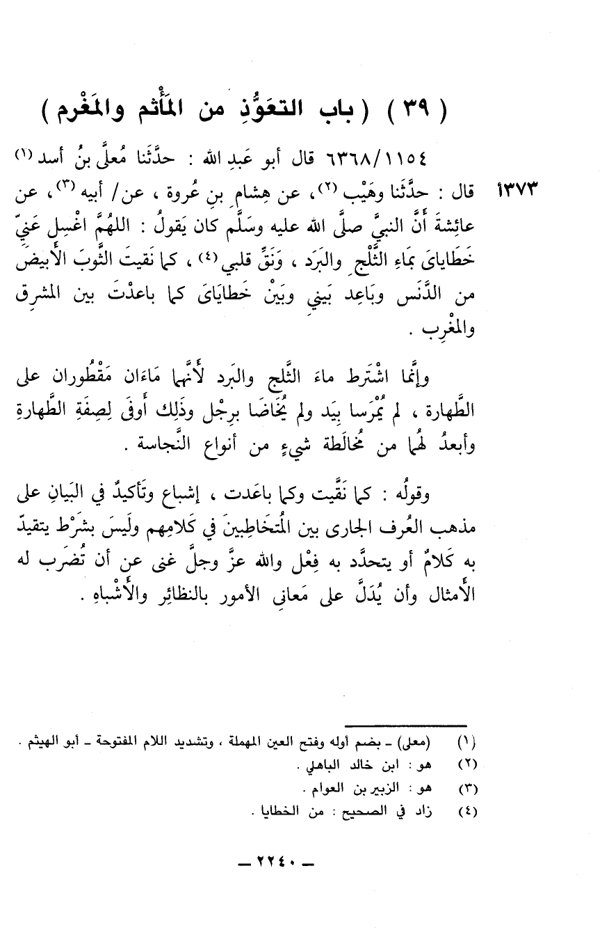 1154/ 6368 - قال أبو عبد الله: حدثنا معلى بن أسد قال: حدثنا وهيب، عن هشام بن عروة، عن، أبيه، عن عائشة أن النبي صلى الله عليه وسلم كان يقول: اللهم اغسل عني خطاياي بماء الثلج والبرد، ونق قلبي، كما نقيت الثوب الأبيض من الدنس وباعد بيني وبين خطاياي كما باعدت بين المشرق والمغرب.