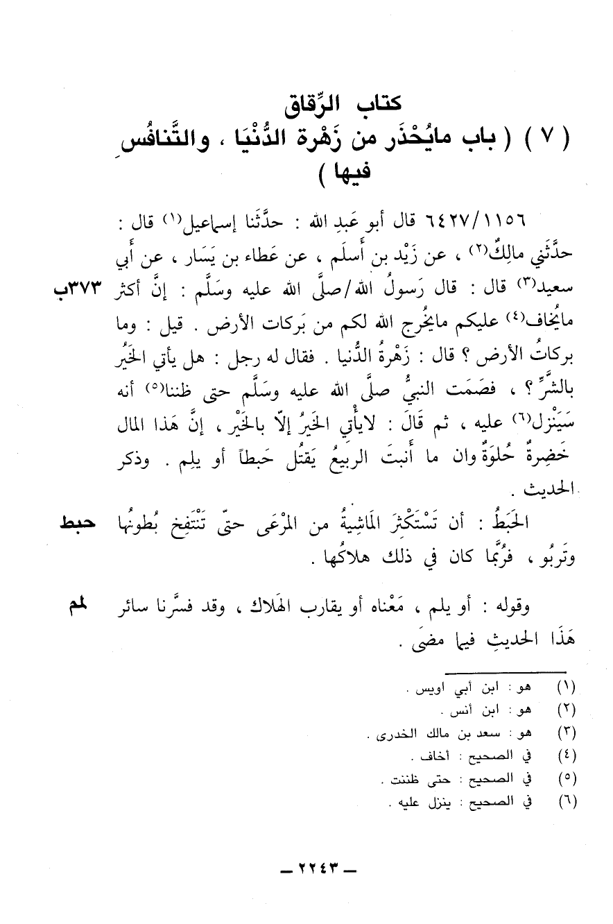 1156/ 6427 - قال أبو عبد الله: حدثنا إسماعيل قال: حدثني مالك، عن زيد بن أسلم، عن عطاء بن يسار، عن أبي سعيد قال: قال رسول الله/ صلى الله عليه وسلم: إن أكثر ما يخاف عليكم ما يخرج الله لكن من بركات الأرض. قيل: وما بركات الأرض؟ قال: زهرة الدنيا. فقال له رجل: هل يأتي الخير بالشر؟، فصمت النبي صلى الله عليه وسلم حتى ظننا أنه ينزل عليه، ثم قال: لا يأتي الخير إلا بالخير، إن هذا المال خضرة حلوة وإن ما أنبت الربيع يقتل حبطا أو يلم. وذكر الحديث.