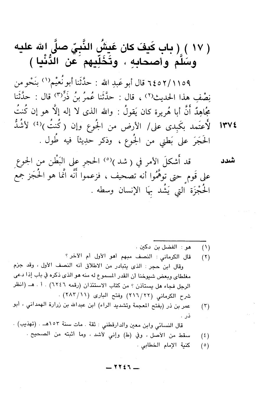 1159/ 6452 - قال أبو عبد الله: حدثنا أبو نعيم بنحو من نصف هذا الحديث، قال: حدثنا عمر بن ذر قال: حدثنا مجاد أن أبا هريرة كان يقول: والله الذي لا إله إلا هو إن كنت لأعتمد بكبدي على/ الأرض من الجوع وإن (كنت) لأشد الحجر على بطني من الجوع، وذكر حديثا فيه طول.