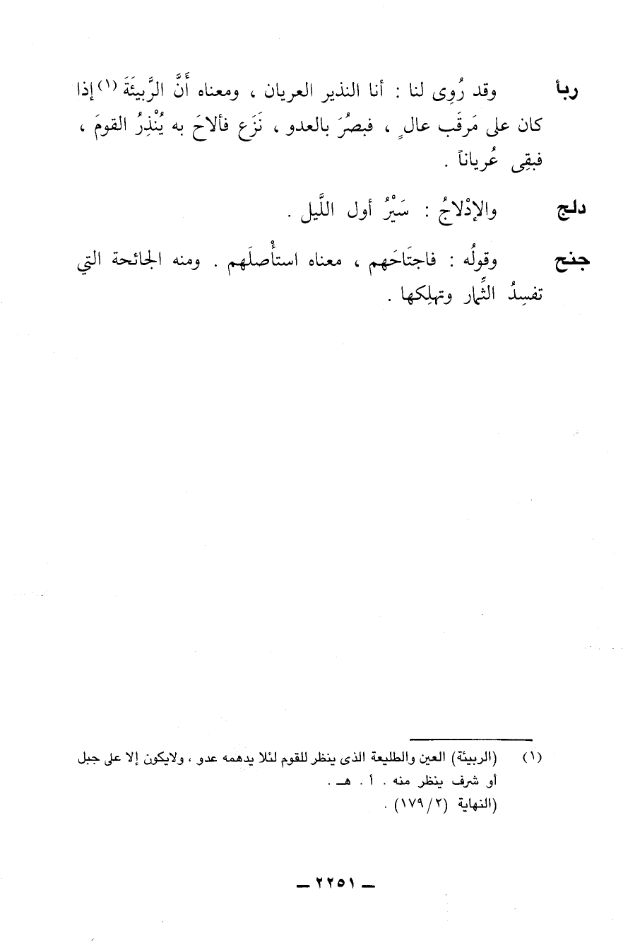 وقد روي لنا: أنا النذير العريان، ومعناه أن الربيئة إذا كان على مرقب عال، فبصر بالعدو، نزع فألاح به ينذر الوقم، فبقى عرياناً.