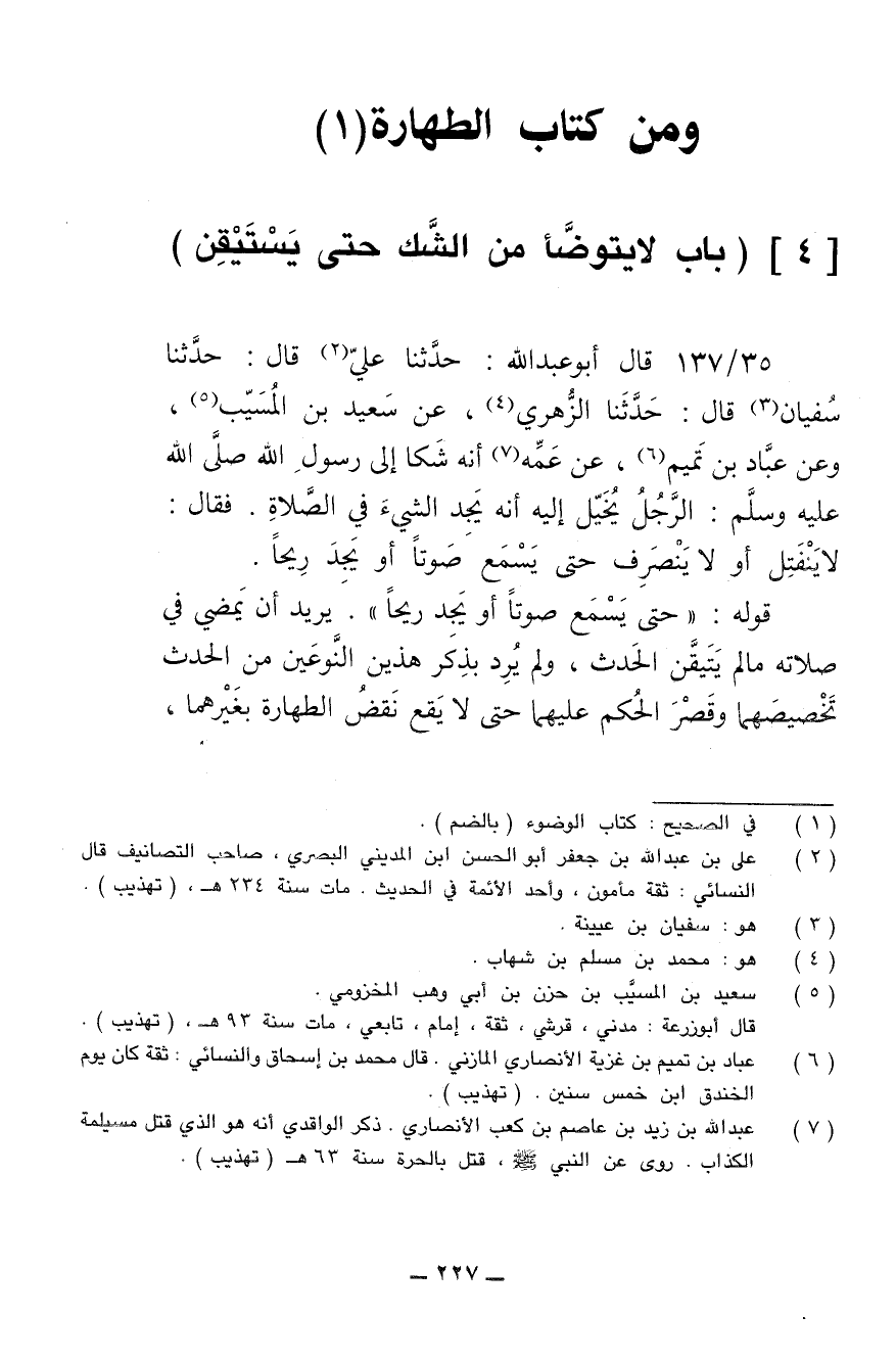 35/ 137 - قال أبو عبد الله: حدثنا علي قال: حدثنا سفيان قال: حدثنا الزهري، عن سعيد بن المسيب، وعن عباد بن تميم، عن عمه أنه شكا إلى رسول الله صلى الله عليه وسلم: الرجل يخيل إليه أنه يجد الشيء في الصلاة. فقال: لا ينفتل أو لا ينصرف حتى يسمع صوتا أو يجد ريحا.
