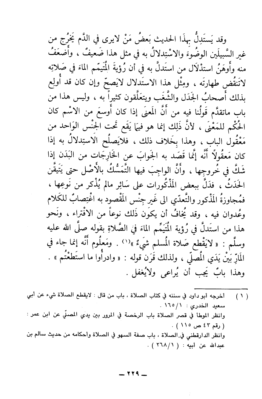 وقد يستدل بهذا الحديث بعض من لا يرى في الدم يخرج من غير السبيلين الوضوء والاستدلال به في مثل هذا ضعيف، وأضعف منه وأوهن استدلال من استدل به في أن رؤية المتيمم الماء في صلاته لا تنقض طهارته، ومثل هذا الاستدلال لا يصح وإن كان قد أولع بذلك أصحاب الجدل والشغب ويتعلقون كثيرا به، وليس هذا من باب ما تقدم قولنا فيه من أن المعنى إذا كان أوسع من الاسم كان الحكم للمعنى، لأن ذلك إنما هو فيما يقع تحت الجنس الواحد من معقول الباب، وهذا بخلاف ذلك، فلا يصلح الاستدلال به إذا كان معقولا أنه إنما قصد به الجواب عن الخارجات من البدن إذا شك في خروجها، وأن الواجب فيها التمسك بالأصل حتى يتيقن الحدث، فدل ببعض المذكورات على سائر ما لم يذكر من نوعها، فمجاوزة المذكور والتعد إلى غير الجنس المقصود به اغتصاب للكلام وعدوان فيه، وقد يخاف أن يكون ذلك نوعا من الافتراء، ونحو هذا من استدل في رؤية المتيمم الماء في الصلاة بقوله صلى الله عليه وسلم: (لا يقطع صلاة المسلم شيء). ومعلوم أنه إنما جاء في المار بين يدي المصلي، ولذلك قرن قوله: (وادرأوا ما استطعتم) وهذا باب يجب أن يراعى ولا يغفل.