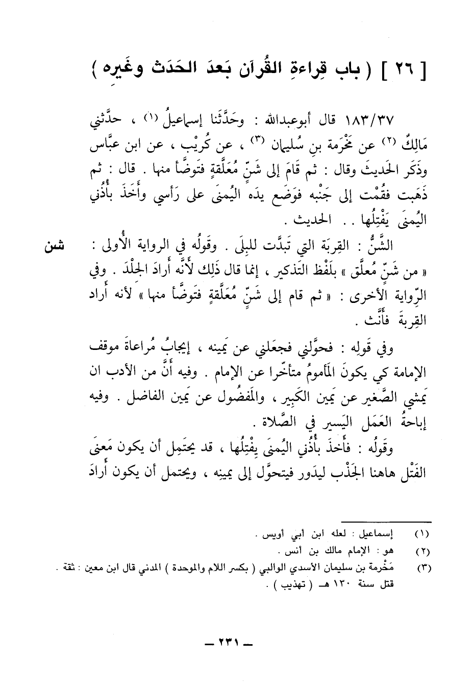 37/ 183 - قال أبو عبد الله: وحدثنا إسماعيل، حدثني مالك عن مخرمة بن سليمان، عن كريب، عن ابن عباس وذكر الحديث وقال: ثم قام إلى شن معلقة فتوضأ منها. قال: ثم ذهبت فقمت إلى جنبه فوضع يده اليمنى على رأسي وأخذ بأذني اليمنى يفتلها .. الحديث.