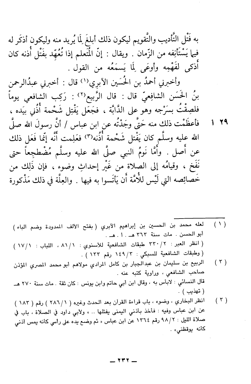 وأخبرني أحمد بن الحسين الآبري قال: أخبرني عبد الرحمن بن الحسن الشافعي قال: قال الربيع: ركب الشافعي يوما فلصقت بسرجه وهو على الدابة، فجعل يفتل شحمة أذني بيده، فأعظمت ذلك منه حتى وجدته عن ابن عباس أن رسول الله صلى الله عليه وسلم كان يفتل شحمة أذنه فعلمت أنه إنما فعل لك عن أصل. وأما نوم النبي صلى الله عليه وسلم مضطجعا حتى نفخ، وقيامه إلى الصلاة من غير إحداث وضوء، فإن ذلك من خصائصه التي ليس للأمة أن يأتسوا به فيها. والعلة في ذلك مذكورة
