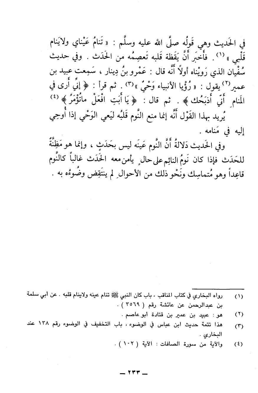 في الحديث وهي قوله صلى الله عليه وسلم: (تنام عيناي ولا ينام قلبي) فأخبر أن يقظة قلبه تعصمه من الحدث. وفي حديث سفيان الذي رويناه أولا أنه قال عمرو بن دينار سمعت عبيد بن عمير يقول: (رؤيا الأنبياء وحي) ثم قر {إني أرى في المنام أني أذبحك} ثم قال {يا أبت افعل ما تؤمر}
