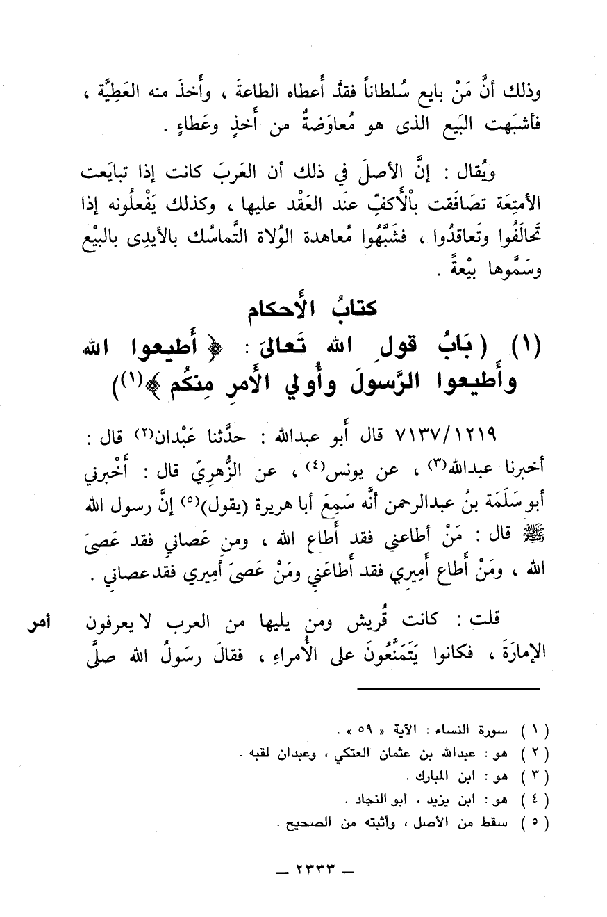 (1) باب قول الله تعالى: (وأَطِيعُوا اللهَ وأَطِيعُوا الرَّسُولَ وَأُولِي الأَمْرِ مِنكُم)