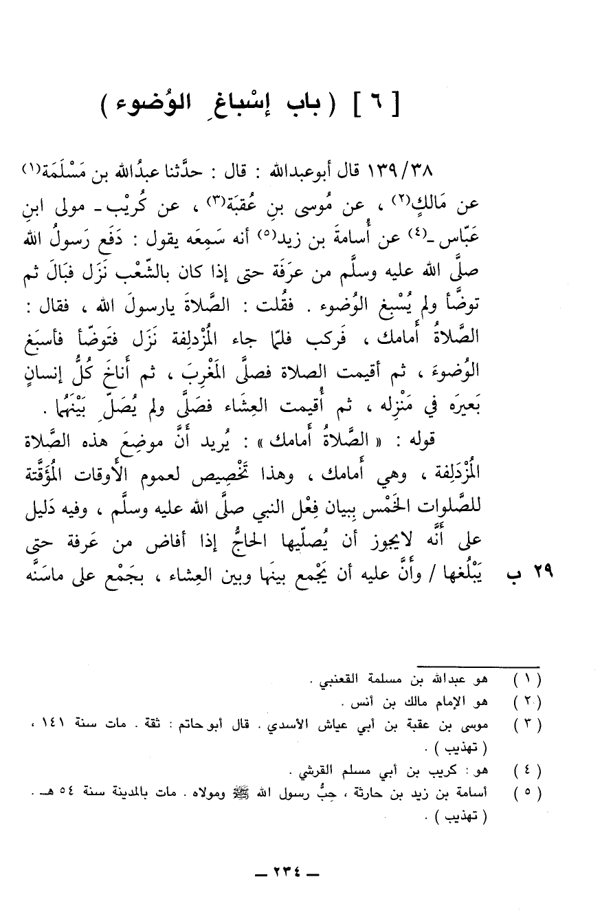 38/ 139 - قال أبو عبد الله: قال: حدثنا عبد الله بن مسلمة عن مالك عن موسى بن عقبة، عن كريب -مولى ابن عباس- عن أسامة بن زيد أنه سمعه يقول: دفع رسول الله صلى الله عليه وسلم من عرفة حتى إذا كان بالشعب نزل فبال ثم توضأ ولم يسبغ الوضوء. فقلت: الصلاة يا رسول الله، فقال: الصلاة أمامك، فركب فلما جاء المزدلفة نزل فتوضأ فأسبغ الوضوء، ثم أقيمت الصلاة فصلى المغرب، ثم أناخ كل إنسان بعيره في منزله، ثم أقيمت العشاء فصلى ولم يصل بينهما.