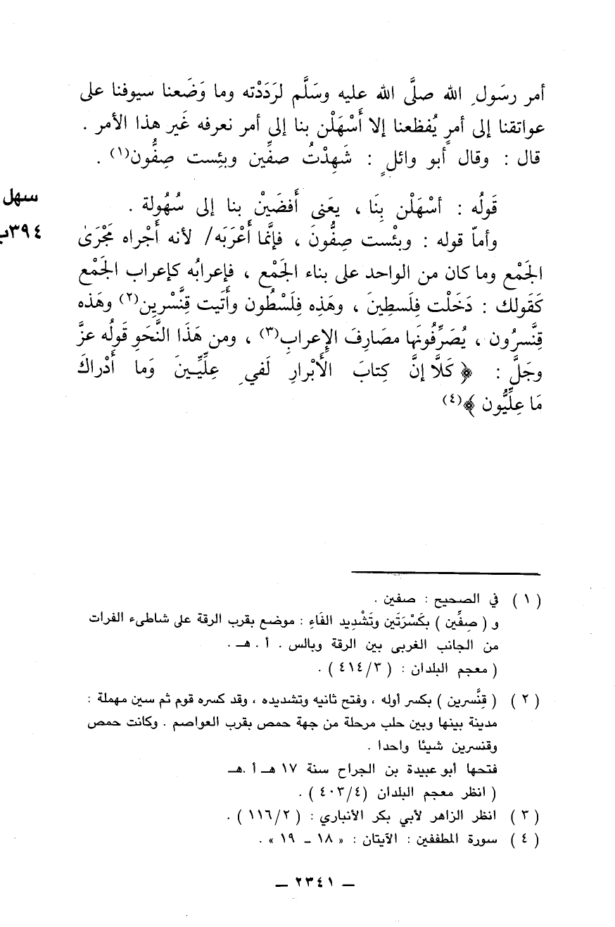 وأما قوله: وبئست صِفُّون, فإنما أعرَبَه لأنه أجراه مجرى الجمع وماكانمن الواحد على بناء المع, فإعرابه كإعراب الجمع, كقولك: دخلت فلسطين, وهذه فلسطون وأتيت قنَّسرين وهذه قنسرون, ويصرفونها مصارف الإعراب, ومن هذا النحو قوله عز وجل: (كَلاَّ إِنَّ كِتَابَ الأَبْرَارِ لَفِي عِلِّيِّين وَمَا أَدْرَاكَ مَا عِلِّيُّونَ)