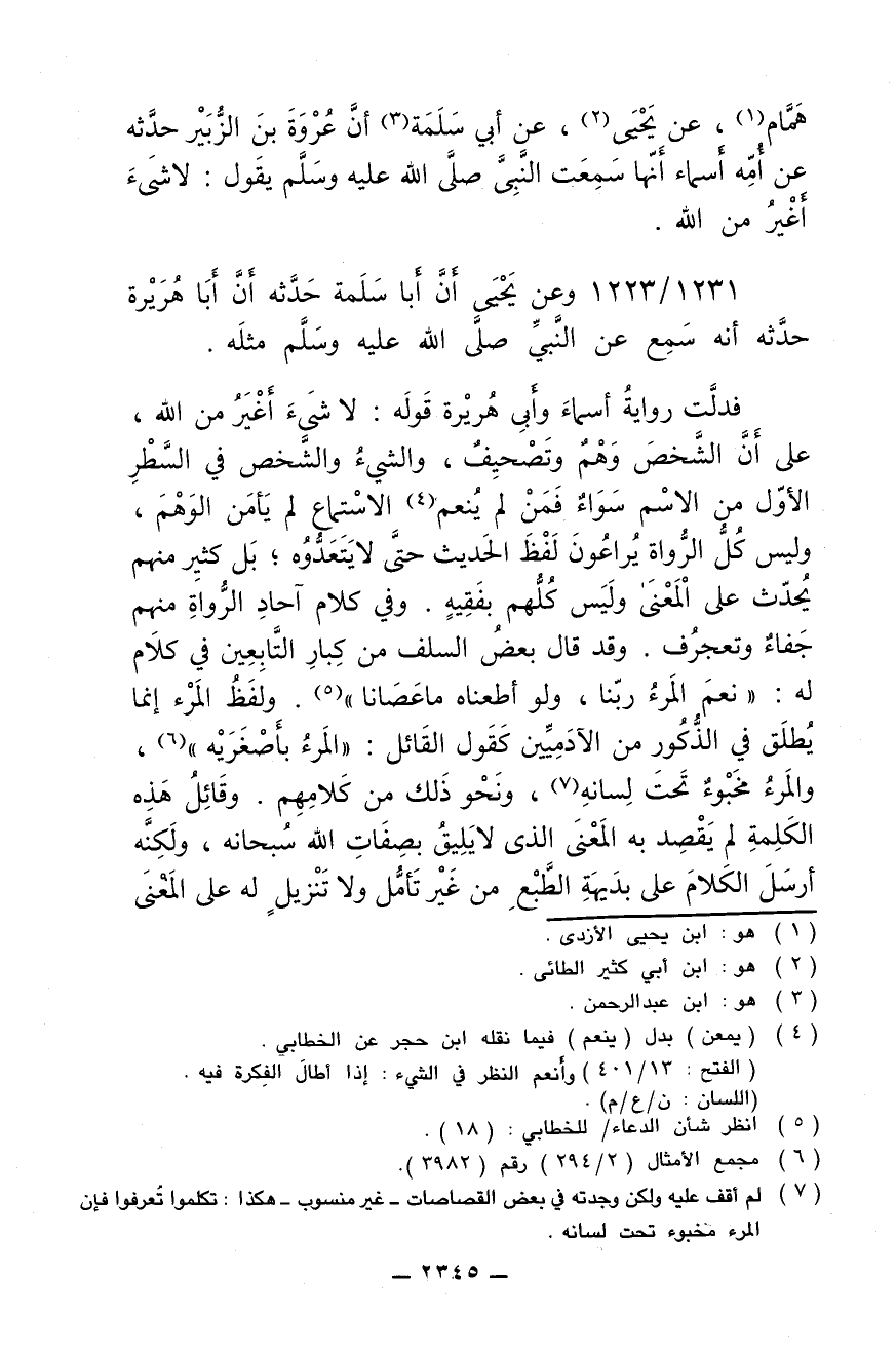 فدلَّت رواية أسماء وأبي هريرة قوله: لا شيء أغير من الله, على أن الشخص وَهْمٌ وتَصْحِيف, والشيء والشخص في السطر الأول من الاسم سواء فمَن لم يُنعم الاستماع لم يأمن الوهم, وليس كل الرواة يُراعون لفظ الحديث حتى لا يَتَعدُّوه؛ بل كثير منهم يُحدّث على المعنى وليس كلهم بفَقِيه. وفي الكلام آحاد الرواة منهم جَفاءٌ وتعجرُف. وقد قال بعض السلف من كبار التابعين في كلام له: "نعم المرءُ ربّنا, ولو أطعناه ما عصانا" ولفظ المرء إنما يُطلق على الذكور الآدميِّين كقول القائل: "المرء بأصْغرَيه", والمرء مخبوء تحت لسانه, ونحو ذلك كلامهم. وقائل هذه الكلمة لم يقصد به المعنى الذي لا يليق بصفات الله سبحانه, ولكنه أرسل الكلام على بديهة الطَّبع من غير تأمل ولا تنزيل له على المعنى