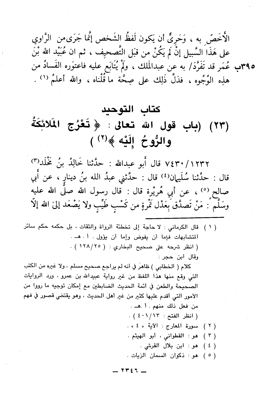 1232/ 7430 - قال أبو عبدالله: حدَّثنا خالد بن مُخلَد قال: حدَّثنا سليمان قال: حدَّثني عبدالله بن دينار, عن أبي صالح, عن أبي هريرة قال: قال رسول الله صلى الله عليه وسلم: من تصدَّق بِعَدْل تمرة من كسبٍ طيبٍ ولا يصعد إلى الله إلا