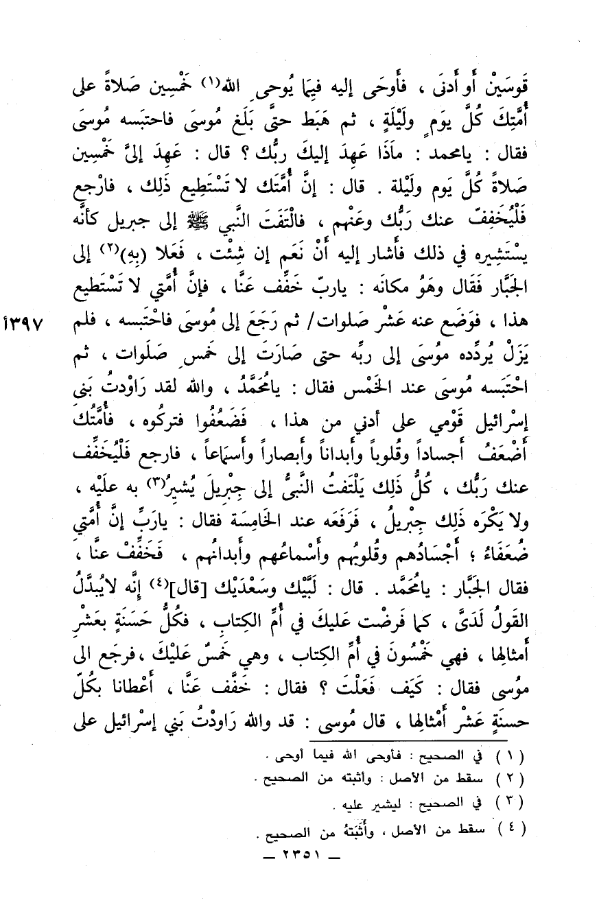 قوسَين أو أَدنَى، فأوحى إليه فيمَا يُوحىِ الله خمسين صلاة على أُمّتِك كل يوم وليلة, ثم هَبَط حتى بلغ موسى فاحْتبَسه موسى فقال: يا محمد ماذا عَهِد إليك ربك؟ قال عَهِد إلي خمسين صلاة كلَّ يوم وليلة. قال: إنَّ أُمَّتَك لا تستطيع ذلك, فارجع فليُخفِفّ عنك ربك وعنهم, فالتفت النبي صلى الله عليه وسلم إلى جبريل كأنه يستشيره في ذلك فأشار إليه جبريل أن نعم إن شِئت, فَعَلَا به إلى الجَبَّار فقال وهو مكانه: ياربّ خفف عنا فإن أمتي لا تستطيع هذا, فوضع عنه عَشْر صلوات/ ثم رَجَعَ إلى موسى فاحْتبَسه, فلم يَزَل يُردِّده موسى إلى ربِّه حتى صَارت إلى خَمس صلوات, ثم احْتَبَسه موسى عند الخَمس فقال: يا محمد, والله لقد رَاودتُ بَني إسرائيل قَومي على أدنى من هذا, فضَعُفُوا فتركُوه, فأُمَّتُك أضعفُ أجسادًا وقلوبًا وأبدانًا وأبصارًا وأسماعًا, فارجع فليُخَفِّف عنك ربك, كل ذلك يلتفت النبي إلى جبريل ليشير به عليه, ولا يكره ذلك جبريل, فرَفَعَه عند الخامسة فقال: يا ربِّ إنَّ أمتي ضُعفاء؛ أجسادهم وقلوبُهم وأسماعُهم وأبدانُهم, فخَفِّف عنَّا, فقال الجَبَّار: يامحمد. قال: لَبَّيْك وسَعْدَيْك. قال: إنه لايُبدَّلُ القَولُ لَدَيّ, كما فَرضْت عَليك في أمَّ الكتاب, فكُلُّ حَسَنَةٍ بعَشْر أمثالِها, فهي خَمسُون في أمَّ الكتاب, وهي خمَسٌ عليك, فرجع إلى موسى فقال: كيف فعلتَ؟ فقال: خَفَّفَ عنّا, أعطانا بكل حَسَنةٍ عَشر أمثالِها, قال موسى: قد والله راودت بني إسرائيل على