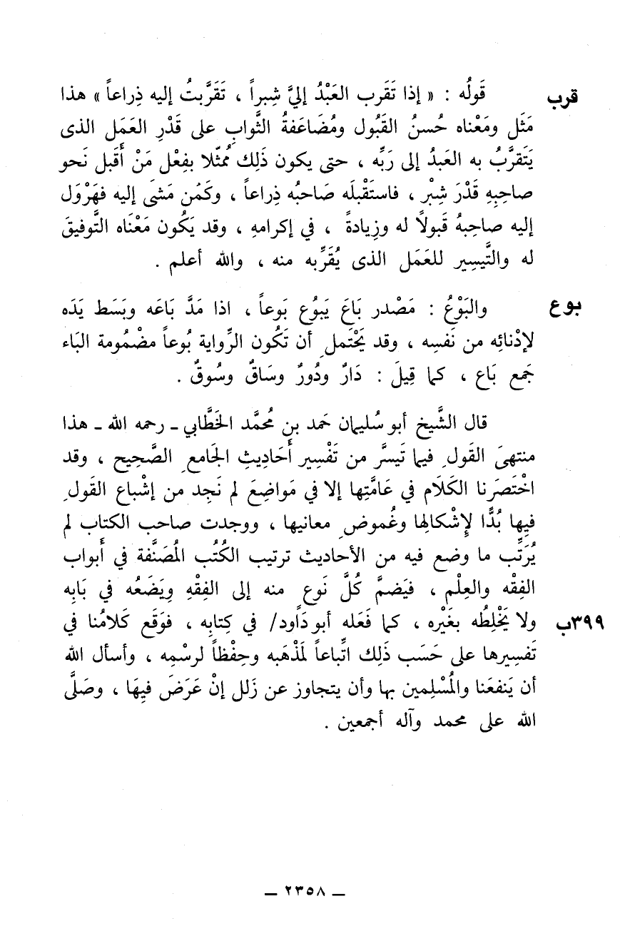 قال الشيخ أبو سليمان حمد بن محمد الخطَّابي -رحمه الله- هذا منتهى القول فيما تيسَّر من تفسير أحاديث الجامع الصحيح, وقد اختصرنا الكلام في عامَّتها إلا في مواضع لم نجد من إشباع القول فيها بُدًّا لإشكالها وغُموض معانيها, ووجدت صاحب الكتاب لم يُرتّب ماوضع فيه من الأحاديث ترتيب الكتب المُصنَّفة في أبواب الفقه والعلم, فيَضمَّ كل نوع منه إلى الفقه ويضعه في بابه ولا يخلطه بغيره, كما فعله أبو داود في كتابه, فوقع كلامنا في تفسيرها على حسب ذلك اتِّباعًا لمذهبه وحِفظًا لرسمه, وأسأل الله أن ينفعنا والمسلمين بها وأن يتجاوز عن الزلل إن عرض فيها, وصلى الله على محمد وآله أجمعين.