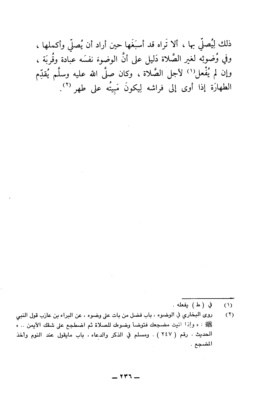 ذلك ليصلي بها، ألا تراه قد أسبغها حين أراد أن يصلي وأكملها، وفي وضوئه لغير الصلاة دليل على أن الوضوء نفسه عبادة وقربة، وإن لم يفعل لأجل الصلاة، وكان صلى الله عليه وسلم يقدم الطهارة إذا أوى إلى فراشه ليكون مبيته على طهر.