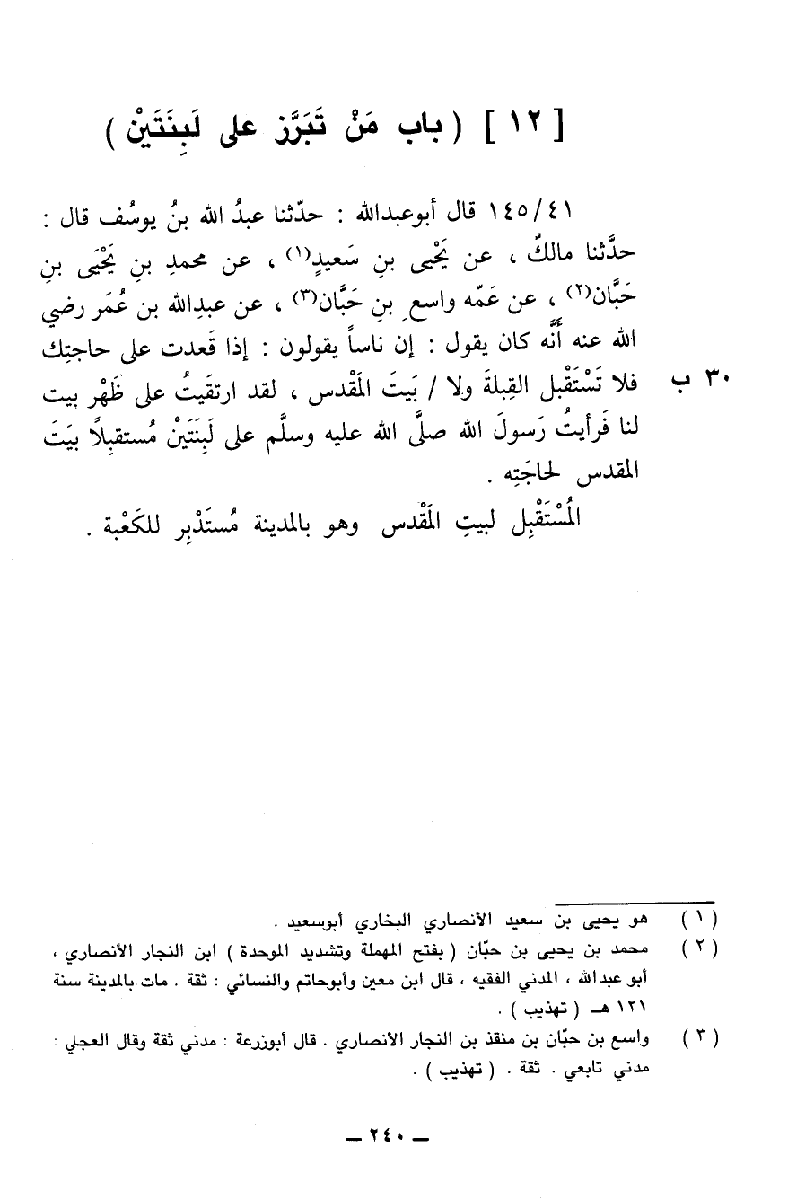 41/ 145 - قال أبو عبد الله: حدثنا عبد الله بن يوسف قال: حدثنا مالك، عن يحيى بن سعيد، عن محمد بن يحيى بن حبان، عن عمه واسع بن حبان، عن عبد الله بن عمر رضي الله عنه أنه كان يقول: إن ناسا يقولون: إذا قعدت على حاجتك فلا تستقبل القبلة ولا بيت المقدس، لقد ارتقيت على ظهر بيت لنا فرأيت رسول الله صلى الله عليه وسلم على لبنتين مستقبلا بيت المقدس لحاجته.