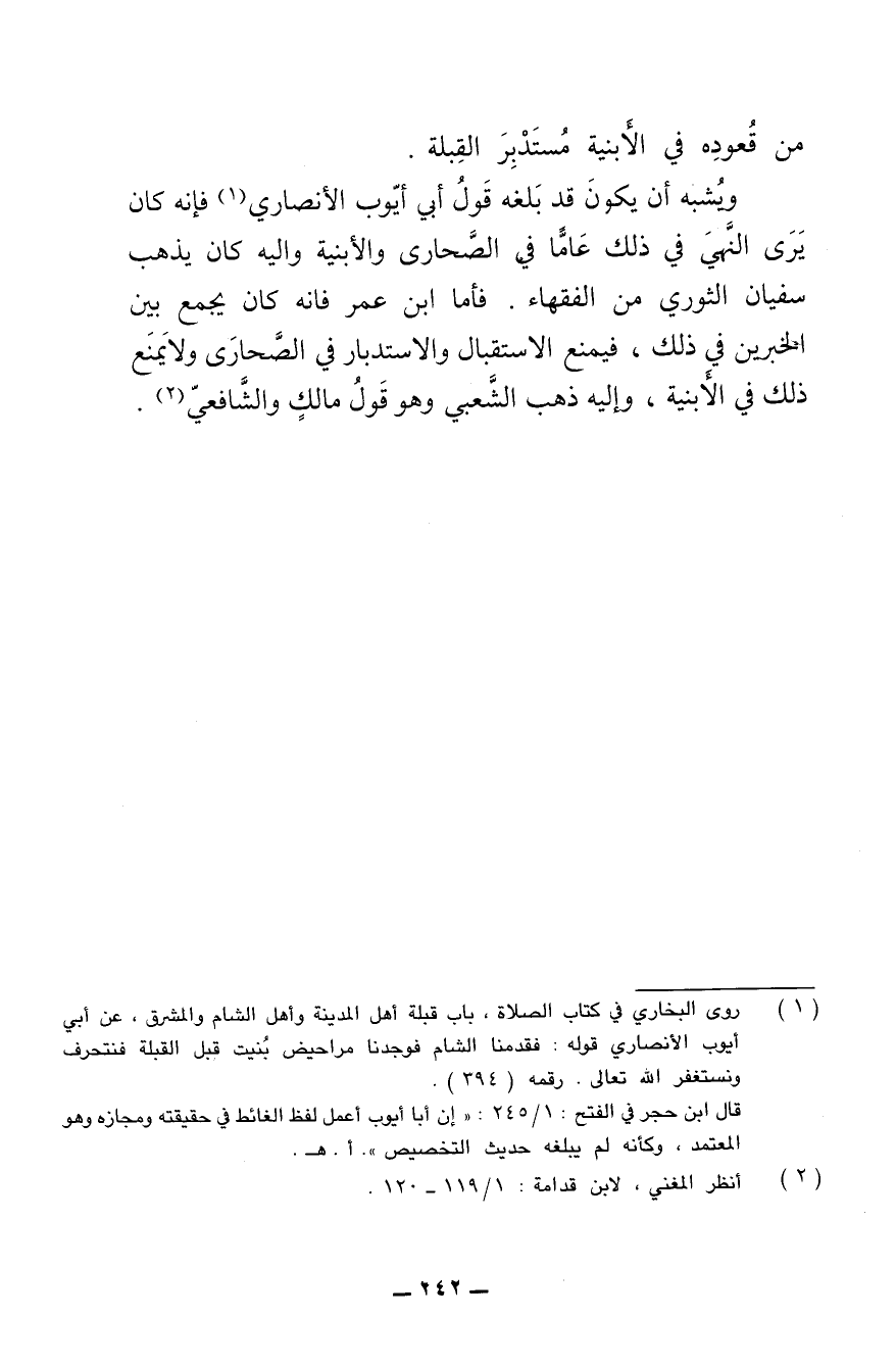 ويشبه أن يكون قد بلغه قول أبي أيوب الأنصاري فإنه كان يرى النهي في ذلك عاما في الصحارى والأبنية وإليه كان يذهب سفيان الثوري من الفقهاء. فأما ابن عمر فإنه كان يجمع بين الخبرين في ذلك، فيمنع الاستقبال والاستدبار في الصحارى ولا يمنع ذلك في الأبنية، وإليه ذهب الشعبي وهو قول مالك والشافعي.