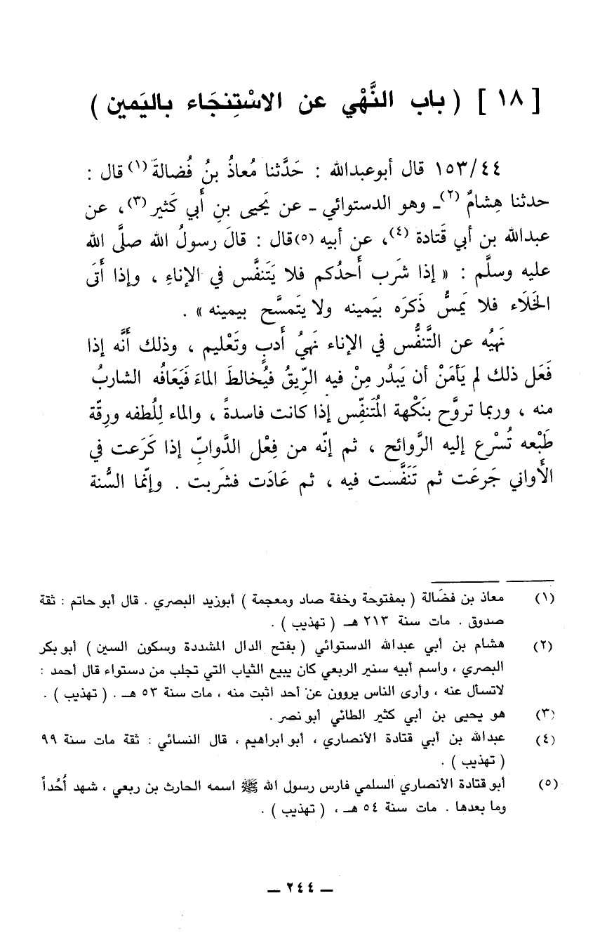 44/ 153 - قال أبو عبد الله: حدثنا معاذ بن فضالة قال: حدثنا هشام -هو الدستوائي- عن يحيى بن أبي كثير، عن عبد الله بن أبي قتادة عن أبيه قال: قال رسول الله صلى الله عليه وسلم: (إذا شرب أحدكم فلا يتنفس في الإناء، وإذا أتى الخلاء فلا يمس ذكره بيمينه ولا يتمسح بيمينه).